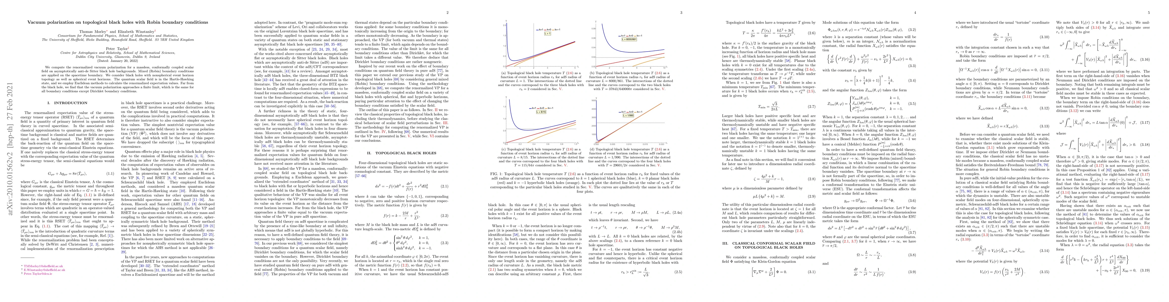 Summary: The paper computes the renormalized vacuum polarization for a massless scalar field on topological black holes with Robin boundary conditions, finding a finite limit that is consistent across various boundary conditions except Dirichlet, while considering both spherical and nonspherical event horizons. Euclidean methods are employed to derive the expectation values.