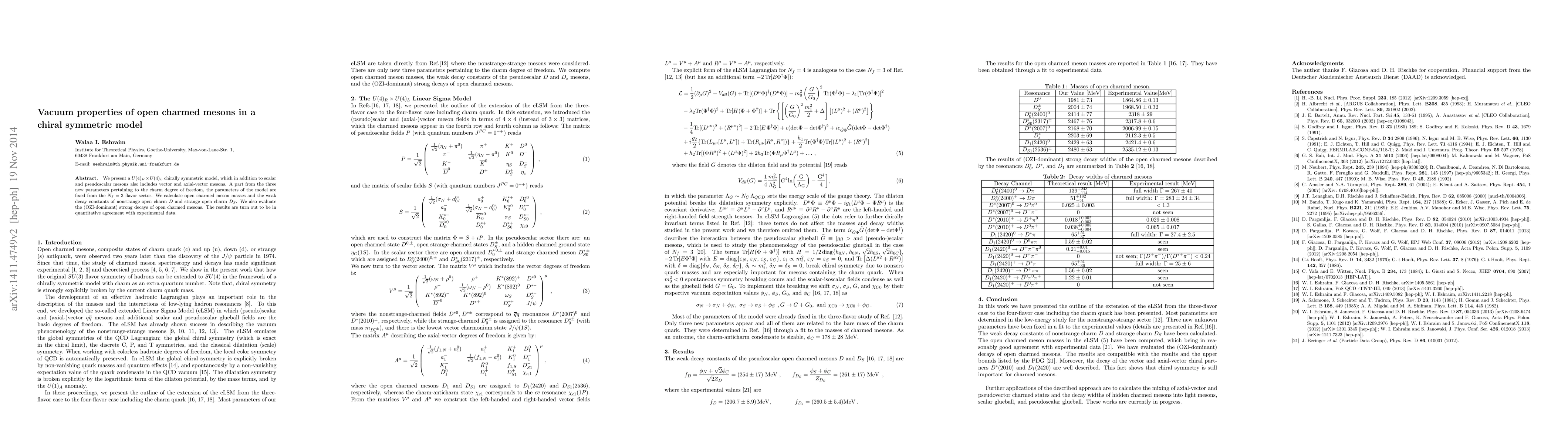 This research utilizes a $U(4)_R \times U(4)_L$ chirally symmetric model to calculate the vacuum properties of open charmed mesons, including masses and decay constants, achieving agreement with experimental data. The model also evaluates strong decay processes for these mesons.