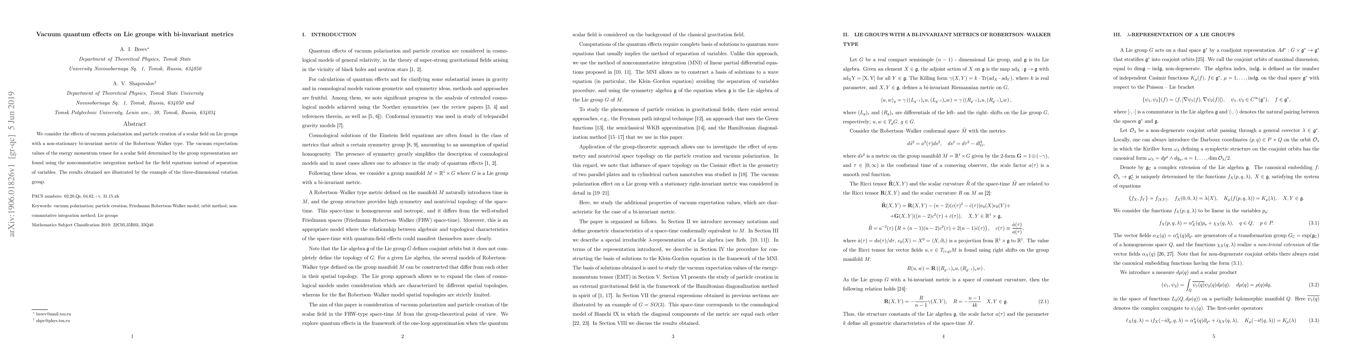 We consider the effects of vacuum polarization and particle creation of a scalar field on Lie groups with a non-stationary bi-invariant metric of the Robertson-Walker type. The vacuum expectation values of the energy momentum tensor for a scalar field determined by the group representation are found using the noncommutative integration method for the field equations instead of separation of variables. The results obtained are illustrated by the example of the three-dimensional rotation group.