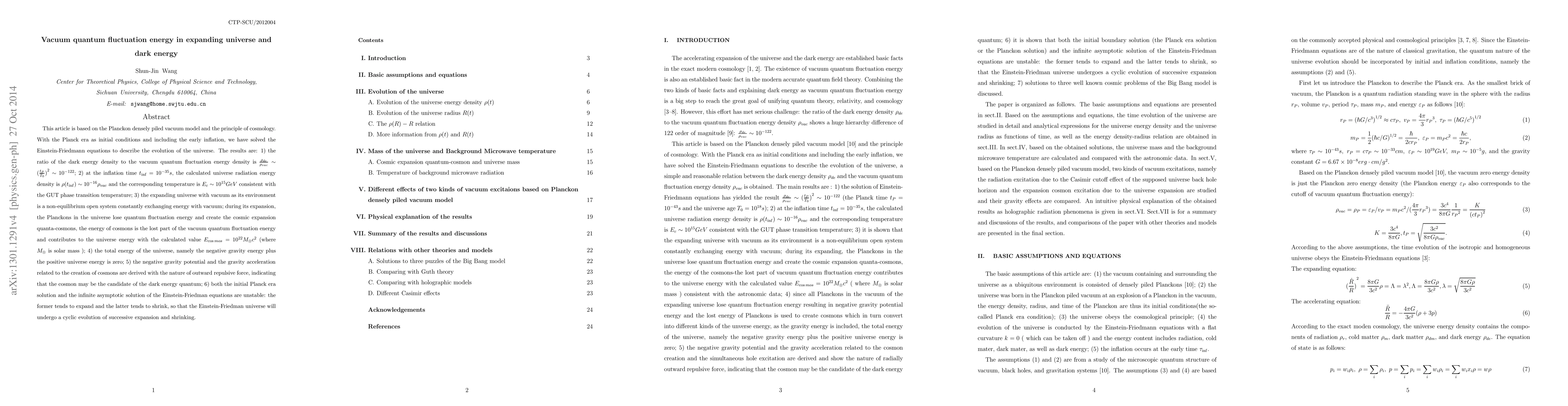 This article is based on the Planckon densely piled vacuum model and the principle of cosmology. With the Planck era as initial conditions and including the early inflation, we have solved the Einstein-Friedmann equations to describe the evolution of the universe. The results are: 1) the ratio of the dark energy density to the vacuum quantum fluctuation energy density is $\frac{{{\rho }_{de}}}{{{\rho }_{vac}}}\sim{{(\frac{{{t}_{P}}}{{{T}_{0}}})}^{2}}\sim{{10}^{-122}} $; 2) at the inflation time ${{t}_{\inf }}={{10}^{-35}}s$, the calculated universe radiation energy density is $\rho ({{t}_{\inf }})\sim{{10}^{-16}}{{\rho }_{vac}}$ and the corresponding temperature is ${{E}_{c}}\sim{{10}^{15}}GeV$ consistent with the GUT phase transition temperature; 3) the expanding universe with vacuum as its environment is a non-equilibrium open system constantly exchanging energy with vacuum; during its expansion, the Planckons in the universe lose quantum fluctuation energy and create the cosmic expansion quanta-cosmons, the energy of cosmons is the lost part of the vacuum quantum fluctuation energy and contributes to the universe energy with the calculated value ${{E}_{\cos mos}}={{10}^{22}}{{M}_{\otimes }}{{c}^{2}}$ (where ${{M}_{\otimes }}$ is solar mass); 4) the total energy of the universe, namely the negative gravity energy plus the positive universe energy is zero; 5) the negative gravity potential and the gravity acceleration related to the creation of cosmons are derived with the nature of outward repulsive force, indicating that the cosmon may be the candidate of the dark energy quantum; 6) both the initial Planck era solution and the infinite asymptotic solution of the Einstein-Friedman equations are unstable: the former tends to expand and the latter tends to shrink, so that the Einstein-Friedman universe will undergo a cyclic evolution of successive expansion and shrinking.