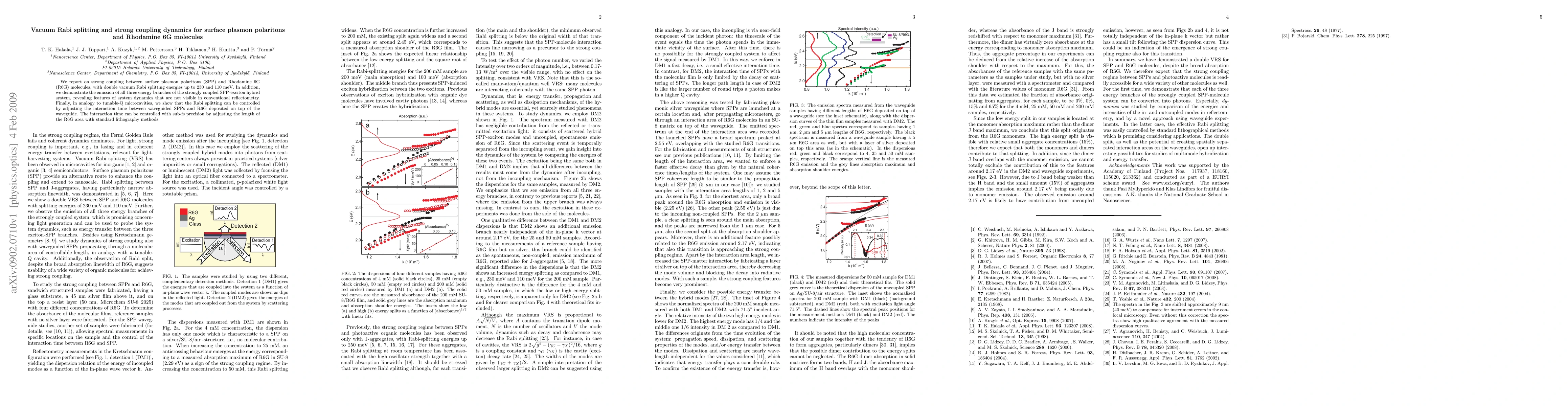 This paper investigates strong coupling dynamics between surface plasmon polaritons and Rhodamine 6G molecules, achieving double vacuum Rabi splitting energies up to 230 and 110 meV. It reveals the emission of all three energy branches of the hybrid system, showcasing dynamics not visible in conventional reflectometry, and demonstrates tunable Rabi splitting by adjusting the interaction time between SPPs and R6G.