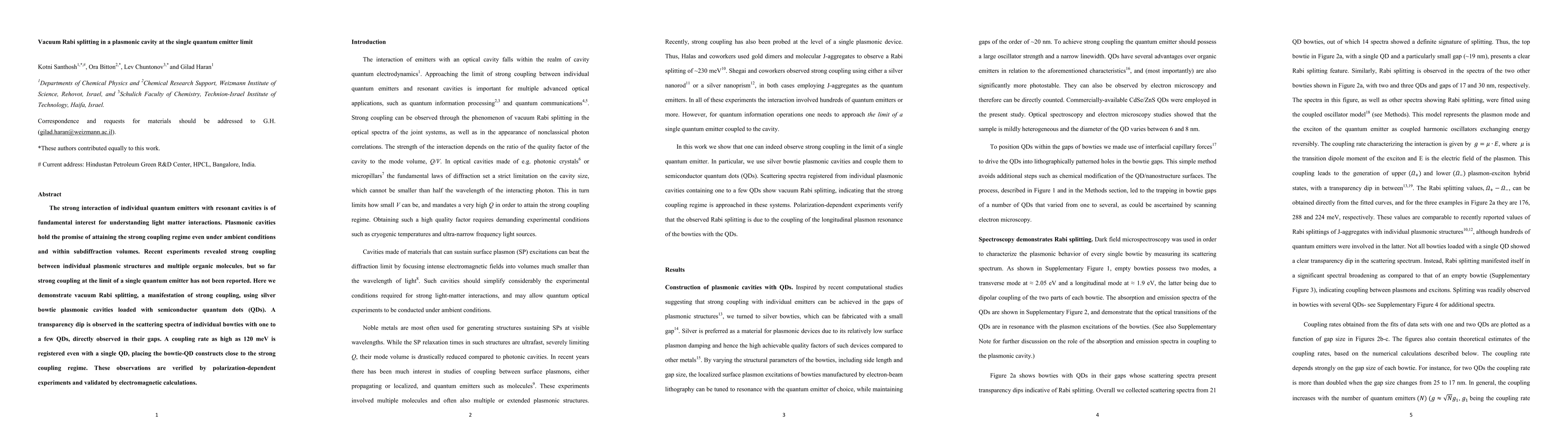 This paper demonstrates vacuum Rabi splitting, indicative of strong coupling, between individual semiconductor quantum dots and silver bowtie plasmonic cavities, achieving coupling rates up to 120 meV even with single quantum dots, verified by polarization experiments and electromagnetic calculations.
