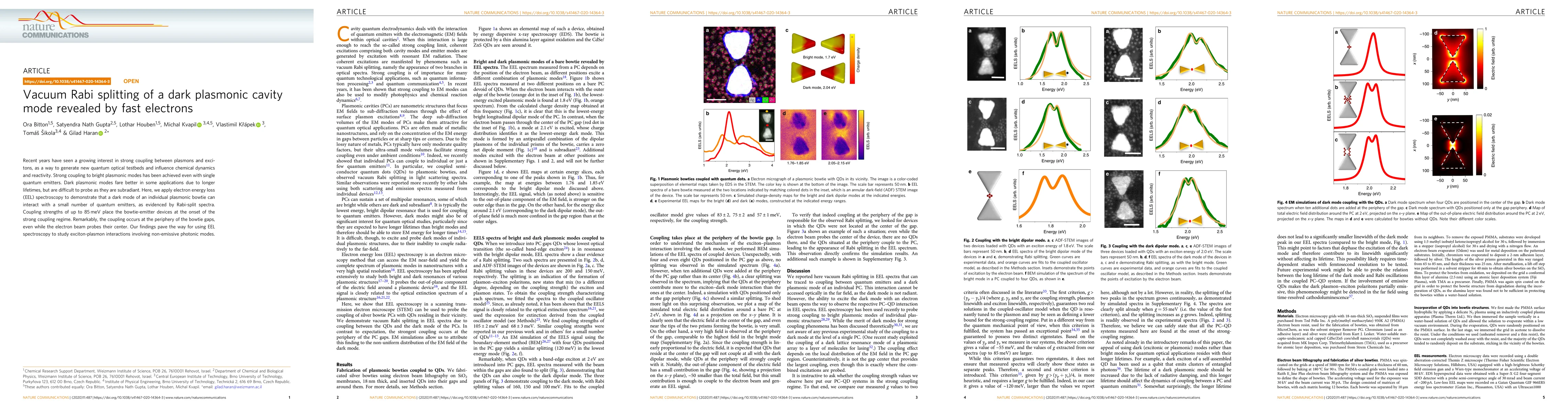Recent years have seen a growing interest in strong coupling between plasmons and excitons, as a way to generate new quantum optical testbeds and influence chemical dynamics and reactivity. Strong coupling to bright plasmonic modes has been achieved even with single quantum emitters. Dark plasmonic modes fare better in some applications due to longer lifetimes, but are difficult to probe as they are subradiant. Here, we apply electron energy loss (EEL) spectroscopy to demonstrate that a dark mode of an individual plasmonic bowtie can interact with a small number of quantum emitters, as evidenced by Rabi-split spectra. Coupling strengths of up to 85 meV place the bowtie-emitter devices at the onset of the strong coupling regime. Remarkably, the coupling occurs at the bowtie gap periphery, even while the electron beam probes their center. Our findings pave the way for using EEL spectroscopy to study exciton-plasmon interactions involving non-emissive photonic modes.