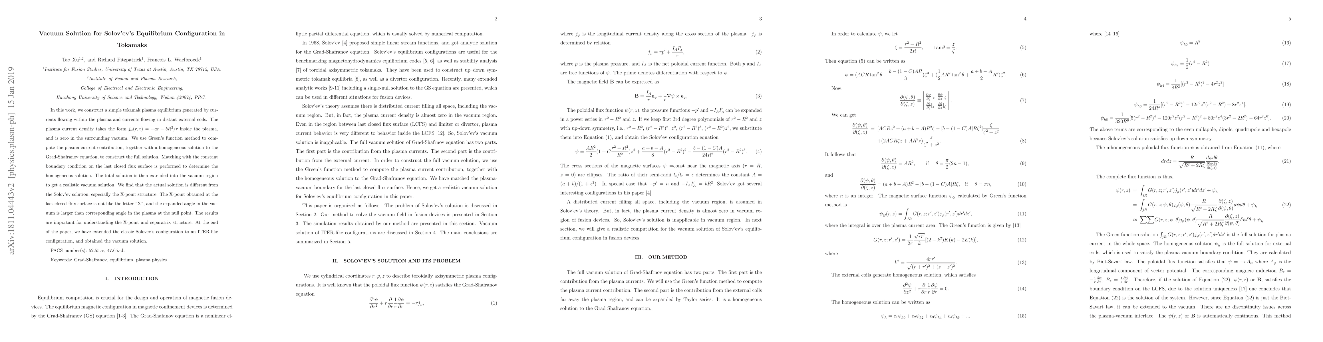 This paper corrects the vacuum solution in Solov'ev's tokamak equilibrium model, which previously assumed a current-filled vacuum. Using Green's function method and Grad-Shafranov equation, the authors find a realistic current-free vacuum solution. Key differences include altered X-point structure in the vacuum, with a larger expanded angle compared to the plasma. These findings enhance understanding of X-point and separatrix structure in tokamaks, with the methodology extended to an ITER-like configuration.