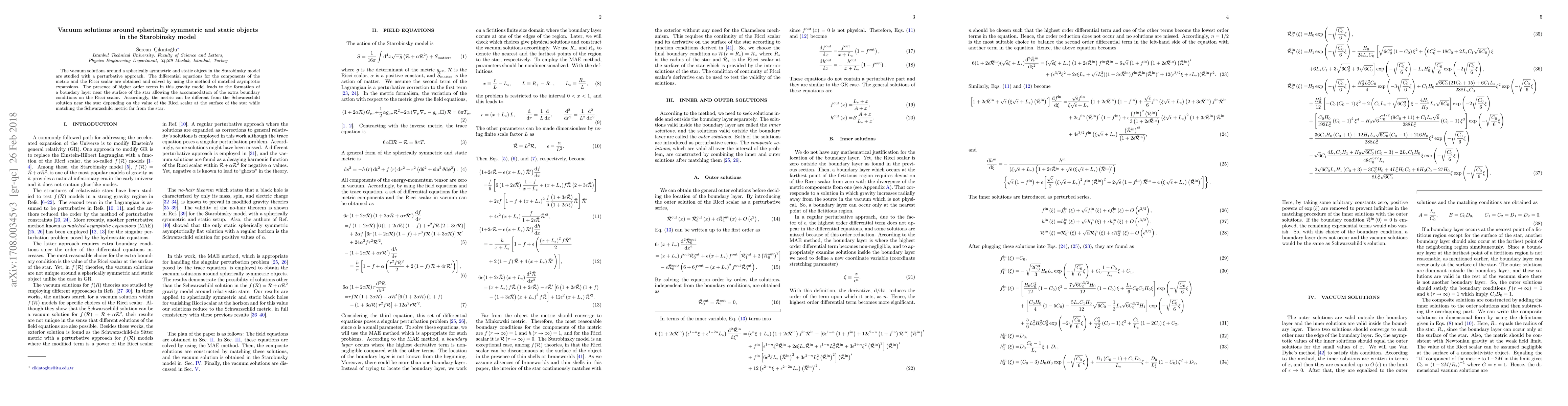 The vacuum solutions around a spherically symmetric and static object in the Starobinsky model are studied with a perturbative approach. The differential equations for the components of the metric and the Ricci scalar are obtained and solved by using the method of matched asymptotic expansions. The presence of higher order terms in this gravity model leads to the formation of a boundary layer near the surface of the star allowing the accommodation of the extra boundary conditions on the Ricci scalar. Accordingly, the metric can be different from the Schwarzschild solution near the star depending on the value of the Ricci scalar at the surface of the star while matching the Schwarzschild metric far from the star.