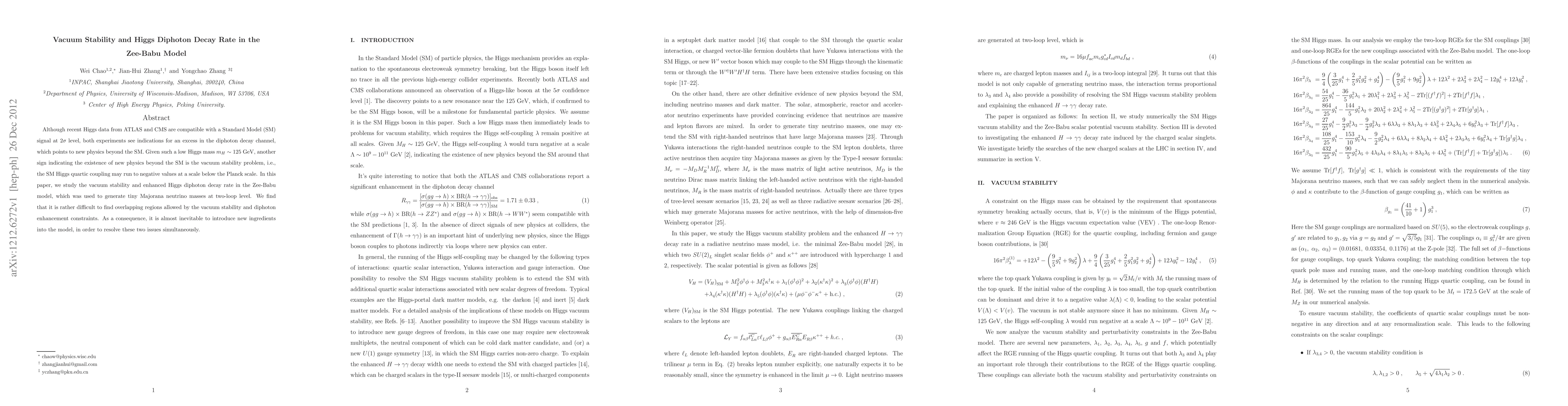This paper investigates vacuum stability and the enhanced Higgs diphoton decay rate in the Zee-Babu model, finding that achieving both simultaneously is challenging, necessitating the introduction of new elements to the model.