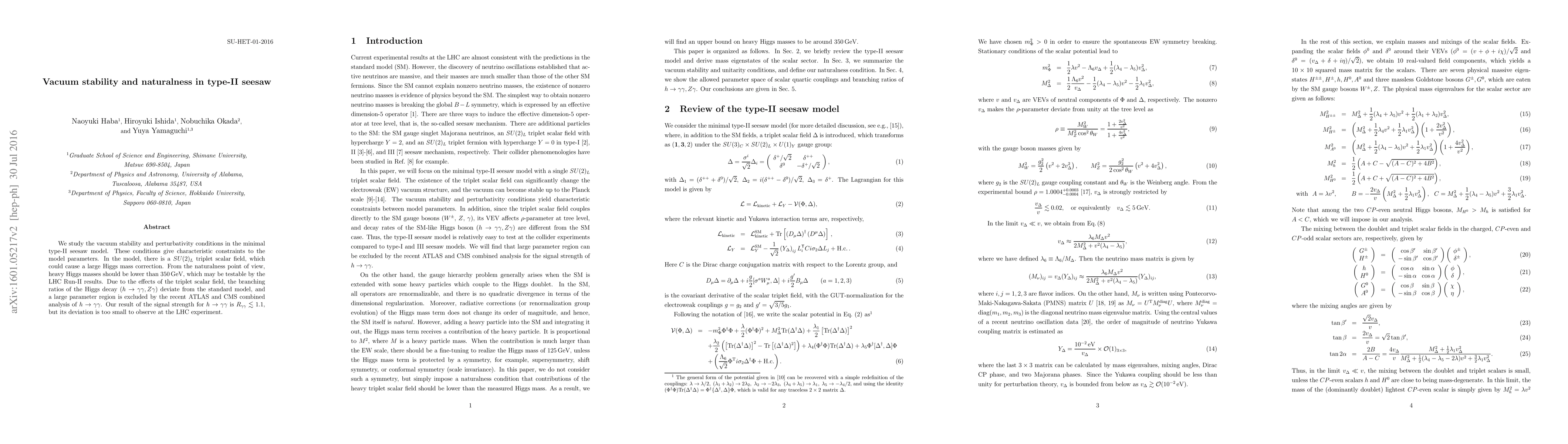 This paper investigates the vacuum stability and perturbativity in the minimal type-II seesaw model, focusing on the constraints imposed by naturalness and the implications for the Higgs mass. The model's $SU(2)_L$ triplet scalar field leads to deviations in Higgs decay branching ratios, particularly $h\to \gamma \gamma$, which are constrained by recent LHC data.