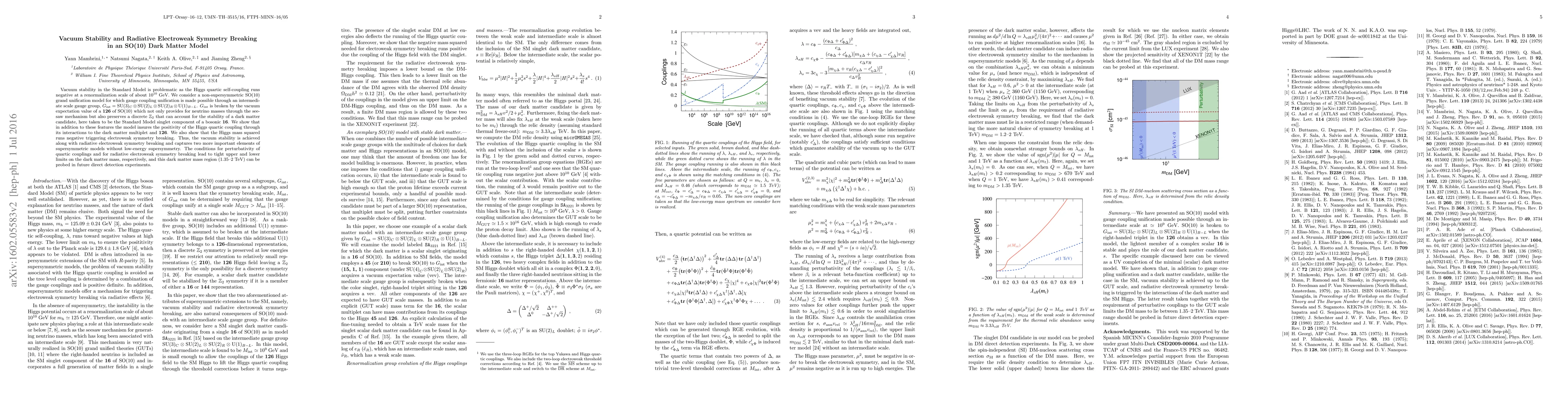 Vacuum stability in the Standard Model is problematic as the Higgs quartic self-coupling runs negative at a renormalization scale of about $10^{10}$ GeV. We consider a non-supersymmetric SO(10) grand unification model for which gauge coupling unification is made possible through an intermediate scale gauge group, $G_{\text{int}}=\text{SU}(3)_C\otimes \text{SU}(2)_L\otimes \text{SU}(2)_R \otimes \text{U}(1)_{B-L}$. $G_{\text{int}}$ is broken by the vacuum expectation value of a 126 of SO(10) which not only provides for neutrino masses through the seesaw mechanism but also preserves a discrete $\mathbb{Z}_2$ that can account for the stability of a dark matter candidate, here taken to be the Standard Model singlet component of a bosonic 16. We show that in addition to these features the model insures the positivity of the Higgs quartic coupling through its interactions to the dark matter multiplet and 126. We also show that the Higgs mass squared runs negative triggering electroweak symmetry breaking. Thus, the vacuum stability is achieved along with radiative electroweak symmetry breaking and captures two more important elements of supersymmetric models without low-energy supersymmetry. The conditions for perturbativity of quartic couplings and for radiative electroweak symmetry breaking lead to tight upper and lower limits on the dark matter mass, respectively, and this dark matter mass region (1.35-2 TeV) can be probed in future direct detection experiments.