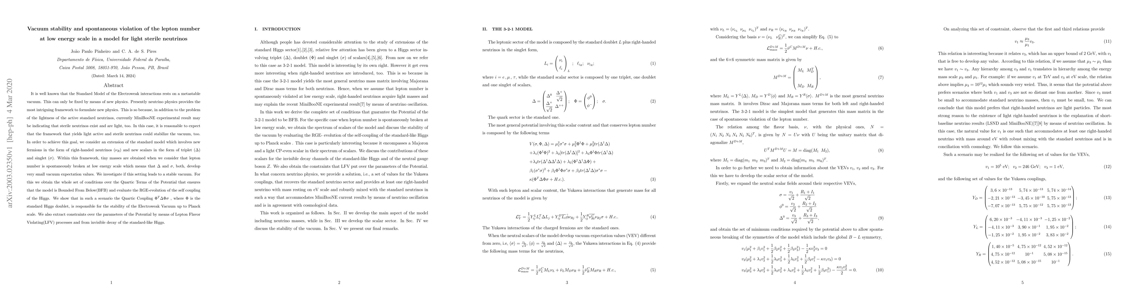 It is well known that the Standard Model of the Electroweak interactions rests on a metastable vacuum. This can only be fixed by means of new physics. Presently neutrino physics provides the most intriguing framework to formulate new physics. This is so because, in addition to the problem of the lightness of the active standard neutrinos, currently MiniBooNE experimental result may be indicating that sterile neutrinos exist and are light, too. In this case, it is reasonable to expect that the framework that yields light active and sterile neutrinos could stabilize the vacuum, too. In order to achieve this goal, we consider an extension of the standard model which involves new fermions in the form of right-handed neutrinos ($\nu_R$) and new scalars in the form of triplet ($\Delta$) and singlet ($\sigma$). Within this framework, tiny masses are obtained when we consider that lepton number is spontaneously broken at low energy scale which means that $\Delta$ and $\sigma$, both, develop very small vacuum expectation values. We investigate if this setting leads to a stable vacuum. For this we obtain the whole set of conditions over the Quartic Terms of the Potential that ensures that the model is Bounded From Below(BFB) and evaluate the RGE-evolution of the self coupling of the Higgs. We show that in such a scenario the Quartic Coupling $\Phi^T \Delta \Phi \sigma$, where $\Phi$ is the standard Higgs doublet, is responsible for the stability of the Electroweak Vacuum up to Planck scale. We also extract constraints over the parameters of the Potential by means of Lepton Flavor Violating(LFV) processes and from invisible decay of the standard-like Higgs.