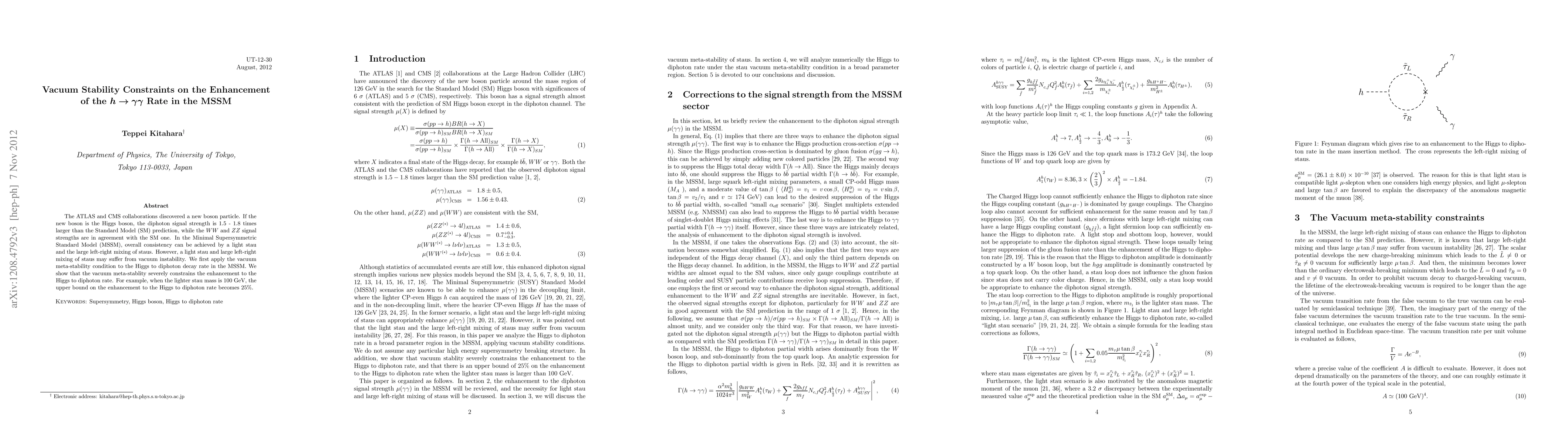 The ATLAS and CMS collaborations discovered a new boson particle. If the new boson is the Higgs boson, the diphoton signal strength is 1.5 - 1.8 times larger than the Standard Model (SM) prediction, while the WW and ZZ signal strengths are in agreement with the SM one. In the Minimal Supersymmetric Standard Model (MSSM), overall consistency can be achieved by a light stau and the large left-right mixing of staus. However, a light stau and large left-right mixing of staus may suffer from vacuum instability. We first apply the vacuum meta-stability condition to the Higgs to diphoton decay rate in the MSSM. We show that the vacuum meta-stablity severely constrains the enhancement to the Higgs to diphoton rate. For example, when the lighter stau mass is 100 GeV, the upper bound on the enhancement to the Higgs to diphoton rate becomes 25%.