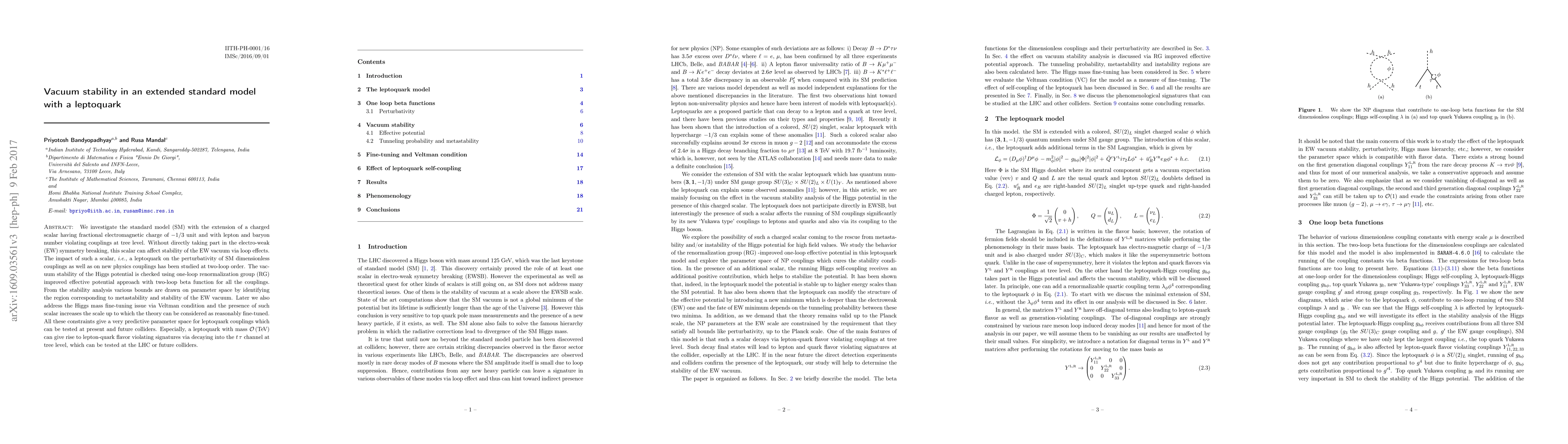 We investigate the standard model (SM) with the extension of a charged scalar having fractional electromagnetic charge of $-1/3$ unit and with lepton and baryon number violating couplings at tree level. Without directly taking part in the electro-weak (EW) symmetry breaking, this scalar can affect stability of the EW vacuum via loop effects. The impact of such a scalar, i.e., a leptoquark on the perturbativity of SM dimensionless couplings as well as on new physics couplings has been studied at two-loop order. The vacuum stability of the Higgs potential is checked using one-loop renormalization group (RG) improved effective potential approach with two-loop beta function for all the couplings. From the stability analysis various bounds are drawn on parameter space by identifying the region corresponding to metastability and stability of the EW vacuum. Later we also address the Higgs mass fine-tuning issue via Veltman condition and the presence of such scalar increases the scale up to which the theory can be considered as reasonably fine-tuned. All these constraints give a very predictive parameter space for leptoquark couplings which can be tested at present and future colliders. Especially, a leptoquark with mass $\mathcal{O}\,$(TeV) can give rise to lepton-quark flavor violating signatures via decaying into the $t\, \tau$ channel at tree level, which can be tested at the LHC or future colliders.