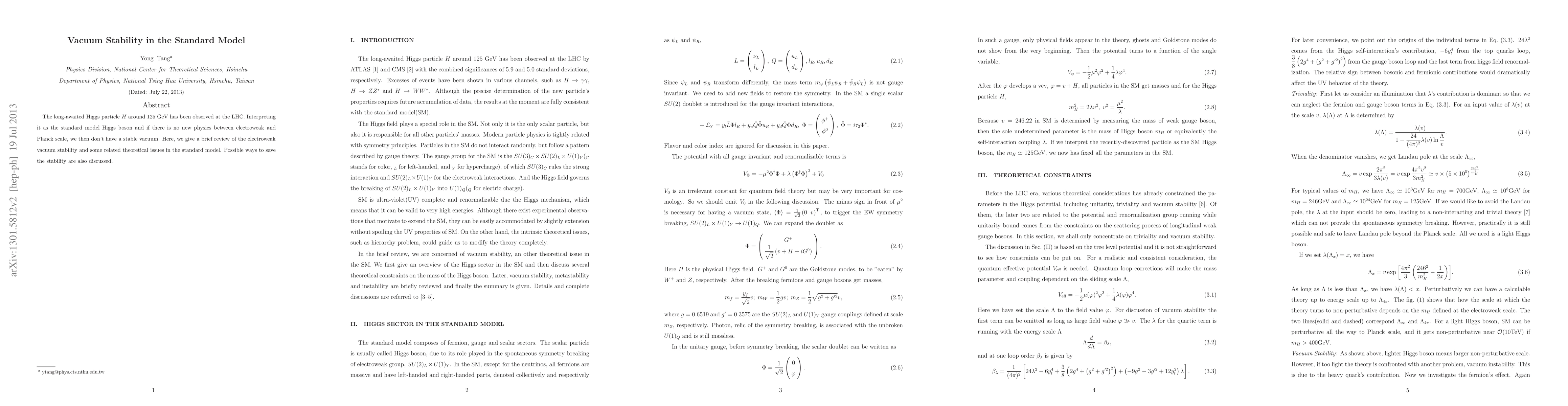 The long-awaited Higgs particle H around 125 GeV has been observed at the LHC. Interpreting it as the standard model Higgs boson and if there is no new physics between electroweak and Planck scale, we then don't have a stable vacuum. Here, we give a brief review of the electroweak vacuum stability and some related theoretical issues in the standard model. Possible ways to save the stability are also discussed.