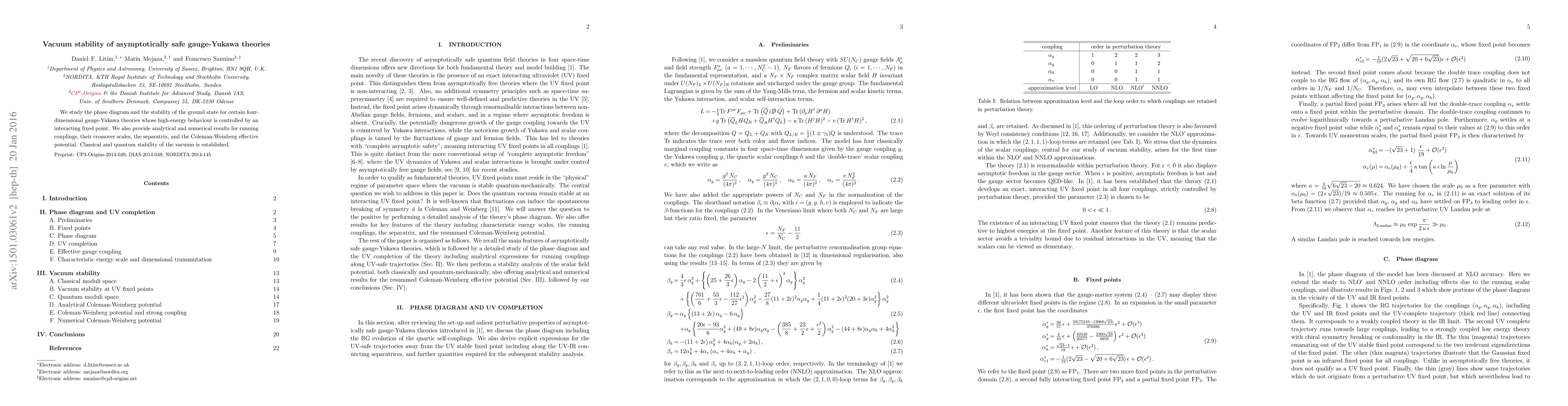 We study the phase diagram and the stability of the ground state for certain four-dimensional gauge-Yukawa theories whose high-energy behaviour is controlled by an interacting fixed point. We also provide analytical and numerical results for running couplings, their crossover scales, the separatrix, and the Coleman-Weinberg effective potential. Classical and quantum stability of the vacuum is established.