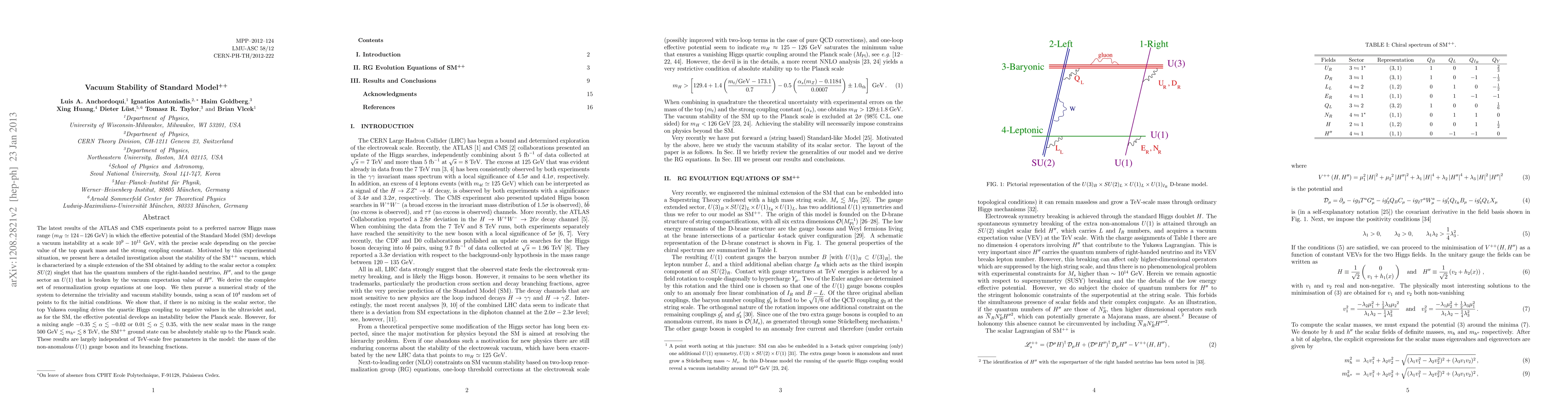 The latest results of the ATLAS and CMS experiments point to a preferred narrow Higgs mass range (m_h \simeq 124 - 126 GeV) in which the effective potential of the Standard Model (SM) develops a vacuum instability at a scale 10^{9} -10^{11} GeV, with the precise scale depending on the precise value of the top quark mass and the strong coupling constant. Motivated by this experimental situation, we present here a detailed investigation about the stability of the SM^{++} vacuum, which is characterized by a simple extension of the SM obtained by adding to the scalar sector a complex SU(2) singlet that has the quantum numbers of the right-handed neutrino, H", and to the gauge sector an U(1) that is broken by the vacuum expectation value of H". We derive the complete set of renormalization group equations at one loop. We then pursue a numerical study of the system to determine the triviality and vacuum stability bounds, using a scan of 10^4 random set of points to fix the initial conditions. We show that, if there is no mixing in the scalar sector, the top Yukawa coupling drives the quartic Higgs coupling to negative values in the ultraviolet and, as for the SM, the effective potential develops an instability below the Planck scale. However, for a mixing angle -0.35 \alt \alpha \alt -0.02 or 0.01 \alt \alpha \alt 0.35, with the new scalar mass in the range 500 GeV \alt m_{h"} \alt 8 TeV, the SM^{++} ground state can be absolutely stable up to the Planck scale. These results are largely independent of TeV-scale free parameters in the model: the mass of the non-anomalous U(1) gauge boson and its branching fractions.