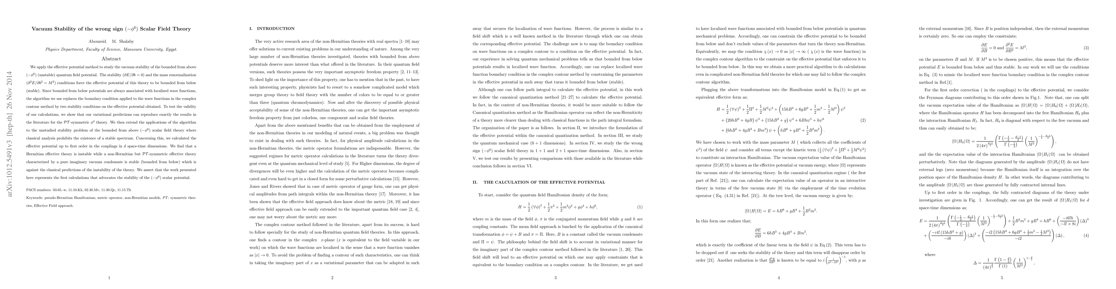 We apply the effective potential method to study the vacuum stability of the bounded from above $(-\phi^{6})$ (unstable) quantum field potential. The stability ($\partial E/\partial b=0)$ and the mass renormalization ($\partial^{2} E/\partial b^{2}=M^{2})$ conditions force the effective potential of this theory to be bounded from below (stable). Since bounded from below potentials are always associated with localized wave functions, the algorithm we use replaces the boundary condition applied to the wave functions in the complex contour method by two stability conditions on the effective potential obtained. To test the validity of our calculations, we show that our variational predictions can reproduce exactly the results in the literature for the $\mathcal{PT}$-symmetric $\phi^{4}$ theory. We then extend the applications of the algorithm to the unstudied stability problem of the bounded from above $(-\phi^{6})$ scalar field theory where classical analysis prohibits the existence of a stable spectrum. Concerning this, we calculated the effective potential up to first order in the couplings in $d$ space-time dimensions. We find that a Hermitian effective theory is instable while a non-Hermitian but $\mathcal{PT}$-symmetric effective theory characterized by a pure imaginary vacuum condensate is stable (bounded from below) which is against the classical predictions of the instability of the theory. We assert that the work presented here represents the first calculations that advocates the stability of the $(-\phi^{6})$ scalar potential.