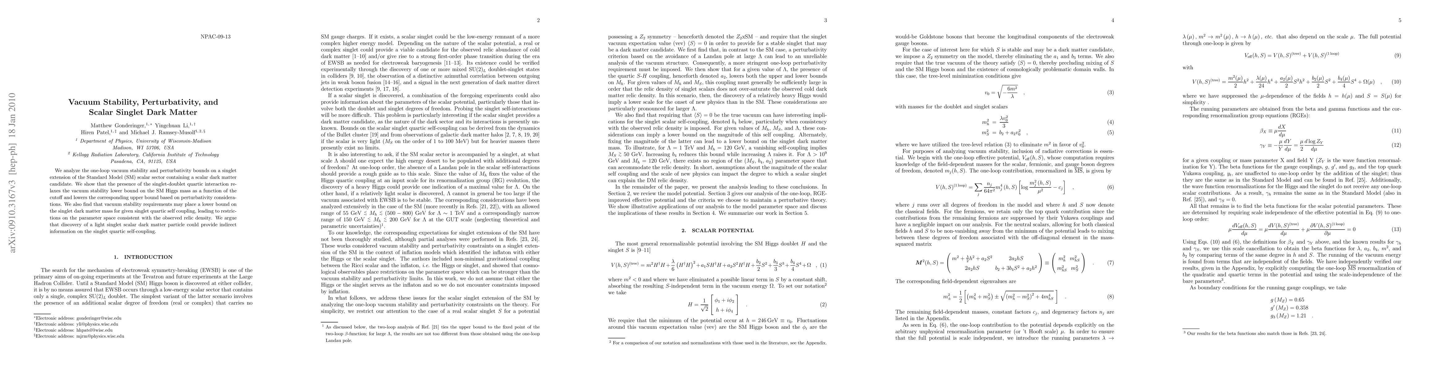 We analyze the one-loop vacuum stability and perturbativity bounds on a singlet extension of the Standard Model (SM) scalar sector containing a scalar dark matter candidate. We show that the presence of the singlet-doublet quartic interaction relaxes the vacuum stability lower bound on the SM Higgs mass as a function of the cutoff and lowers the corresponding upper bound based on perturbativity considerations. We also find that vacuum stability requirements may place a lower bound on the singlet dark matter mass for given singlet quartic self coupling, leading to restrictions on the parameter space consistent with the observed relic density. We argue that discovery of a light singlet scalar dark matter particle could provide indirect information on the singlet quartic self-coupling.