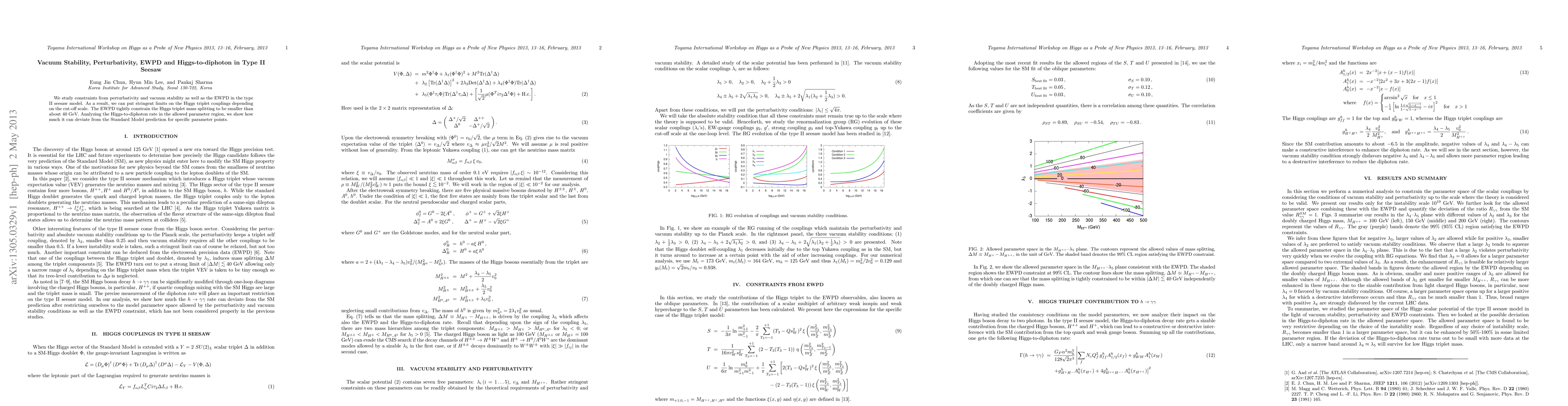 This paper investigates constraints from perturbativity and vacuum stability in the type II seesaw model, finding stringent limits on Higgs triplet couplings. The electroweak precision data (EWPD) constrains the Higgs triplet mass splitting to be less than 40 GeV, while the Higgs-to-diphoton rate shows potential deviations from Standard Model predictions in specific parameter regions.