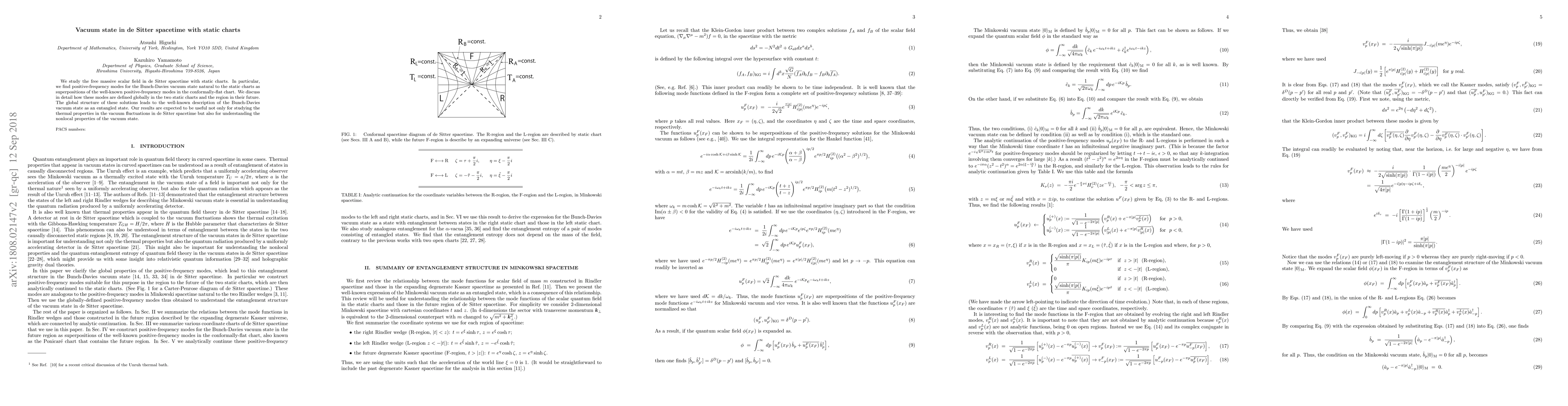 This paper investigates the vacuum state of a massive scalar field in de Sitter spacetime using static charts, identifying the positive-frequency modes of the Bunch-Davies vacuum state. It reveals how these modes are globally defined in static charts and their future regions, highlighting the entangled nature of the vacuum state and its nonlocal properties.