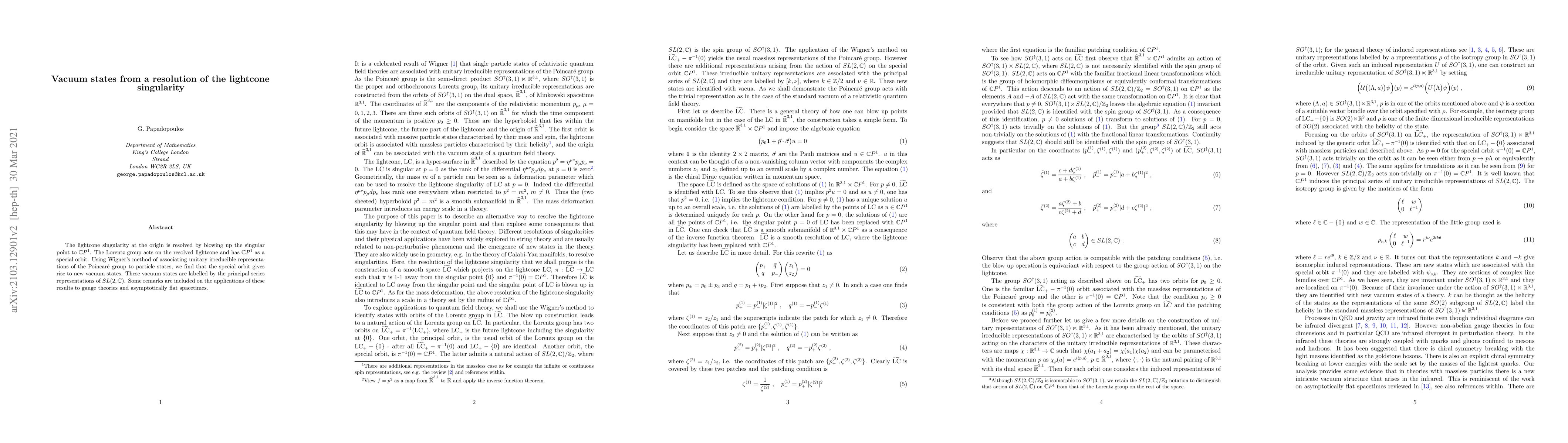 The lightcone singularity at the origin is resolved by blowing up the singular point to $CP^1$. The Lorentz group acts on the resolved lightcone and has $CP^1$ as a special orbit. Using Wigner's method of associating unitary irreducible representations of the Poincar\'e group to particle states, we find that the special orbit gives rise to new vacuum states. These vacuum states are labelled by the principal series representations of $SL(2,C)$. Some remarks are included on the applications of these results to gauge theories and asymptotically flat spacetimes.