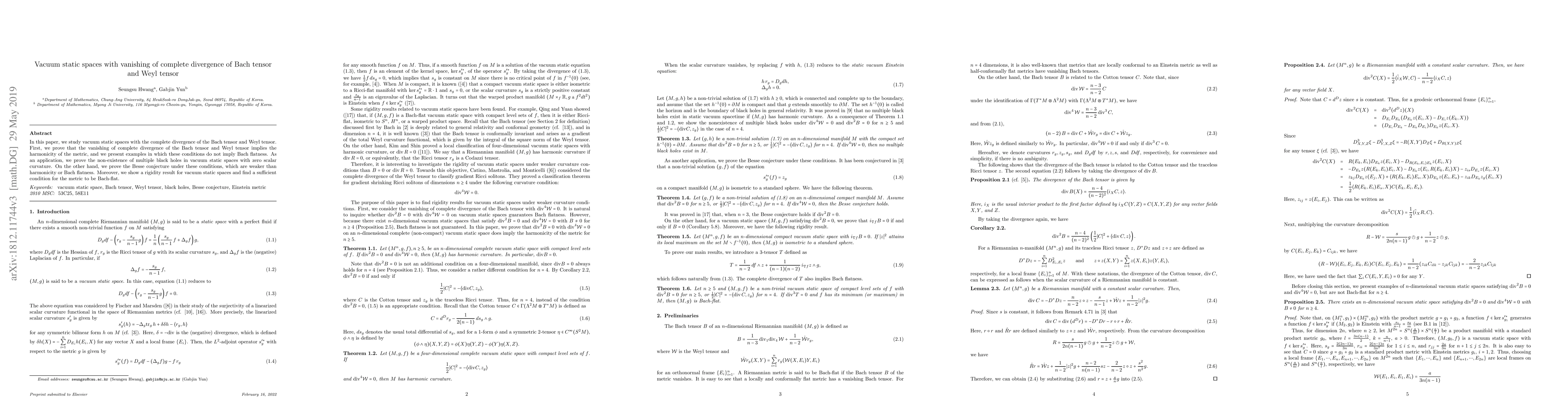This paper explores vacuum static spaces where the complete divergence of the Bach tensor and Weyl tensor vanishes. It proves that this condition implies metric harmonicity and demonstrates non-existence of multiple black holes in such spaces with zero scalar curvature, also proving a weaker version of the Besse conjecture and a rigidity result for these spaces.