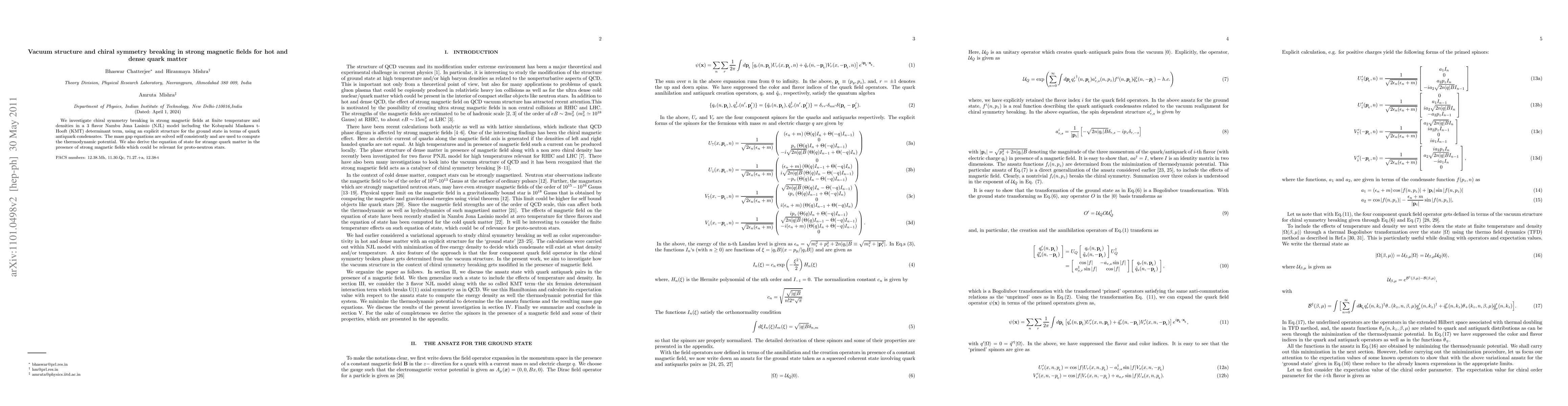 This paper explores chiral symmetry breaking in strong magnetic fields at finite temperature and density using a 3-flavor Nambu Jona-Lasinio model with the KMT determinant term. The study computes the thermodynamic potential and derives the equation of state for strange quark matter, relevant for understanding proto-neutron stars under strong magnetic fields.