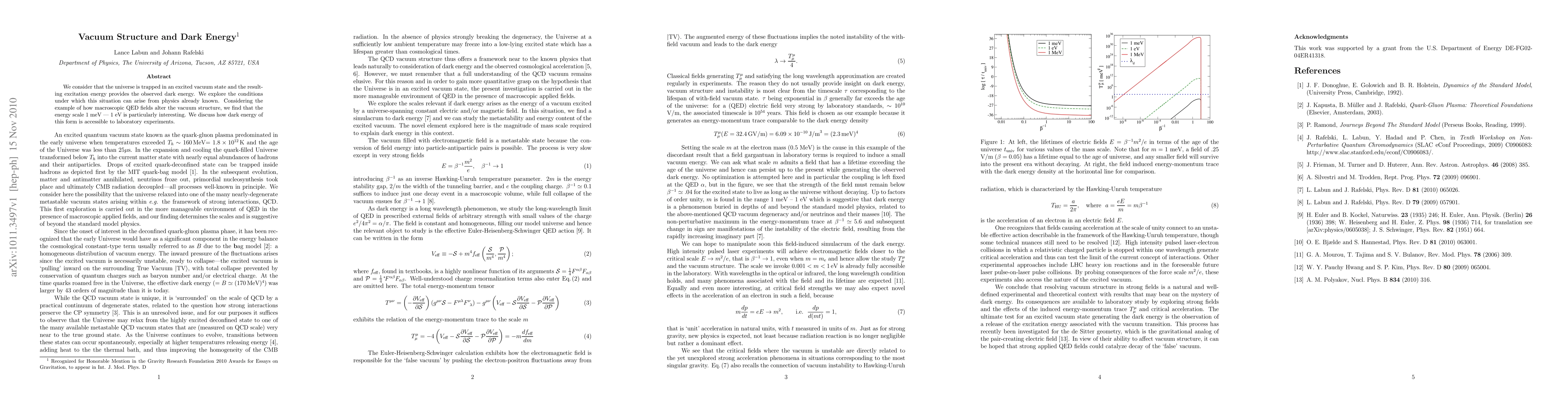 We consider that the universe is trapped in an excited vacuum state and the resulting excitation energy provides the observed dark energy. We explore the conditions under which this situation can arise from physics already known. Considering the example of how macroscopic QED fields alter the vacuum structure, we find that the energy scale 1 meV --- 1 eV is particularly interesting. We discuss how dark energy of this form is accessible to laboratory experiments.