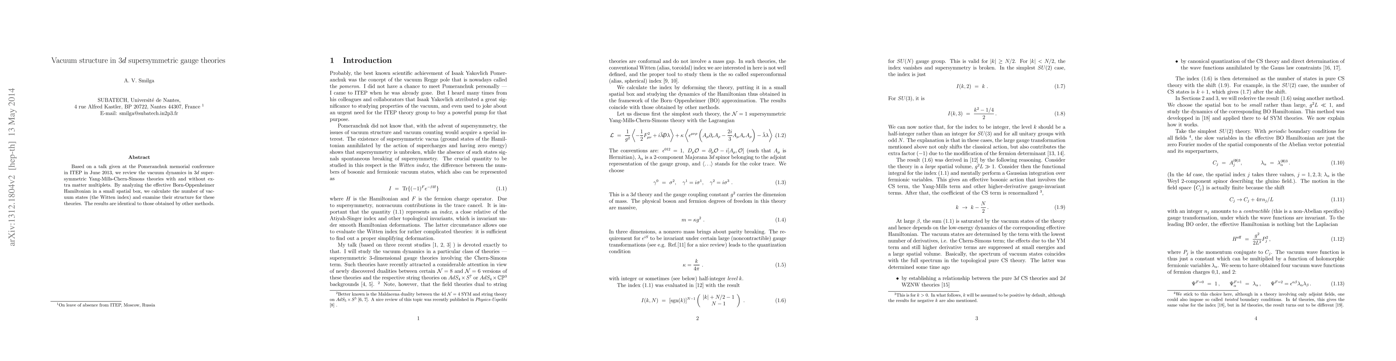 Based on a talk given at the Pomeranchuk memorial conference at ITEP in June 2013, we review the vacuum dynamics in 3d supersymmetric Yang-Mills-Chern-Simons theories with and without extra matter multiplets. By analyzing the effective Born-Oppenheimer Hamiltonian in a small spatial box, we calculate the number of vacuum states (Witten index) and examine their structure for these theories. The results are identical to those obtained by other methods.