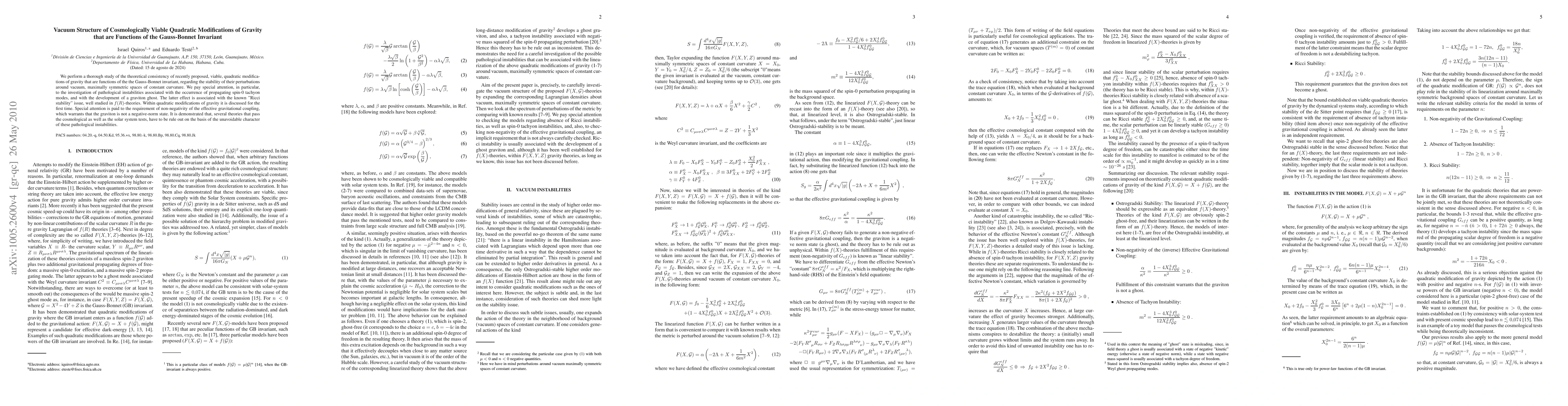 We perform a thorough study of the theoretical consistency of recently proposed, viable, quadratic modifications of gravity that are functions of the the Gauss-Bonnet invariant, regarding the stability of their perturbations around vacuum, maximally symmetric spaces of constant curvature. We pay special attention, in particular, to the investigation of pathological instabilities associated with the occurrence of propagating spin-0 tachyon modes, and with the development of a graviton ghost. The latter effect is associated with the known "Ricci stability" issue, well studied in $f(R)$-theories. Within quadratic modifications of gravity it is discussed for the first time. Special attention is paid to the requirement of non-negativity of the effective gravitational coupling, which warrants that the graviton is not a negative-norm state. It is demonstrated that, several theories that pass the cosmological as well as the solar system tests, have to be rule out on the basis of the unavoidable character of these pathological instabilities.