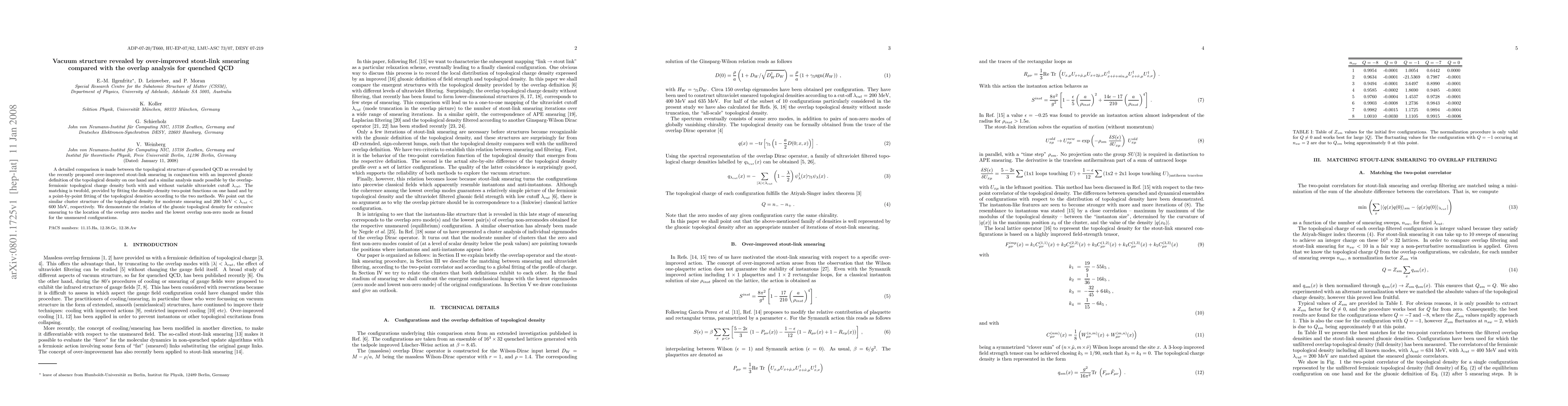 A detailed comparison is made between the topological structure of quenched QCD as revealed by the recently proposed over-improved stout-link smearing in conjunction with an improved gluonic definition of the topological density on one hand and a similar analysis made possible by the overlap-fermionic topological charge density both with and without variable ultraviolet cutoff $\lambda_{cut}$. The matching is twofold, provided by fitting the density-density two-point functions on one hand and by a point-by-point fitting of the topological densities according to the two methods. We point out the similar cluster structure of the topological density for moderate smearing and $200 \mathrm{MeV} < \lambda_{cut} < 600 \mathrm{MeV}$, respectively. We demonstrate the relation of the gluonic topological density for extensive smearing to the location of the overlap zero modes and the lowest overlap non-zero mode as found for the unsmeared configurations.