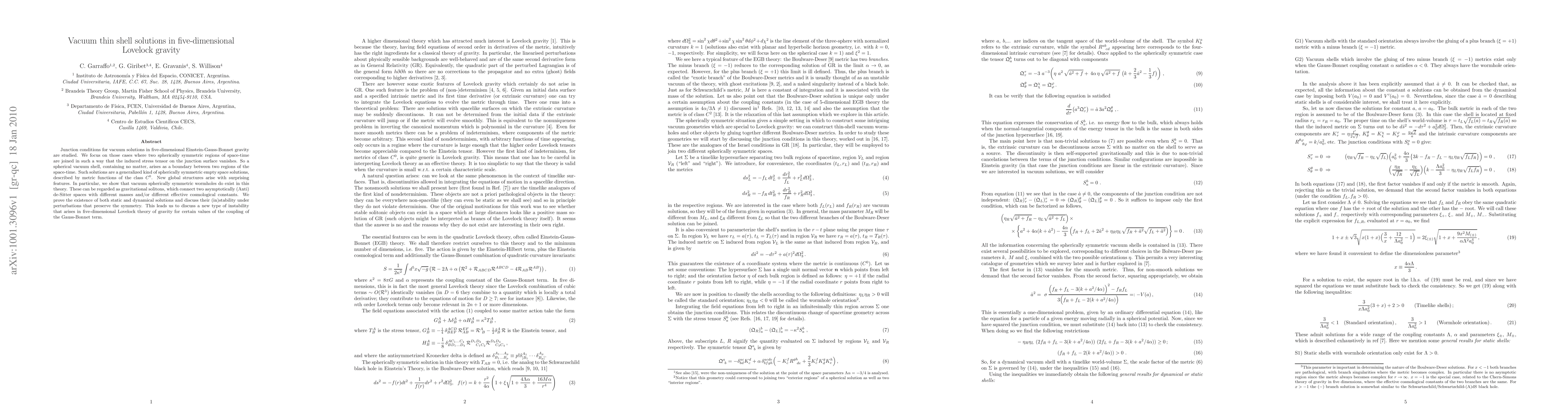 Junction conditions for vacuum solutions in five-dimensional Einstein-Gauss-Bonnet gravity are studied. We focus on those cases where two spherically symmetric regions of space-time are joined in such a way that the induced stress tensor on the junction surface vanishes. So a spherical vacuum shell, containing no matter, arises as a boundary between two regions of the space-time. Such solutions are a generalized kind of spherically symmetric empty space solutions, described by metric functions of the class $C^0$. New global structures arise with surprising features. In particular, we show that vacuum spherically symmetric wormholes do exist in this theory. These can be regarded as gravitational solitons, which connect two asymptotically (Anti) de-Sitter spaces with different masses and/or different effective cosmological constants. We prove the existence of both static and dynamical solutions and discuss their (in)stability under perturbations that preserve the symmetry. This leads us to discuss a new type of instability that arises in five-dimensional Lovelock theory of gravity for certain values of the coupling of the Gauss-Bonnet term.