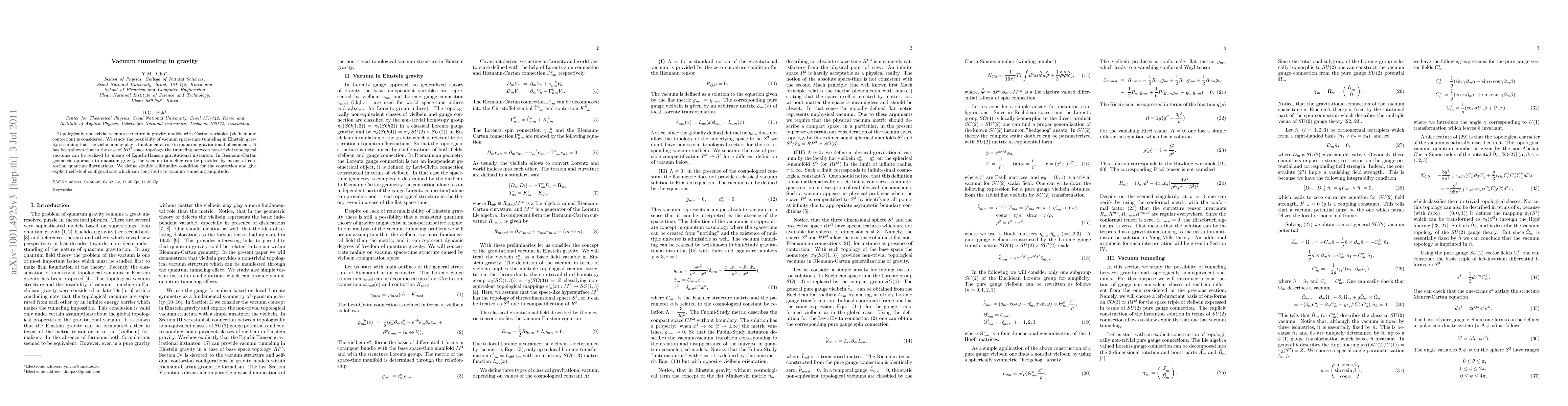 This paper explores vacuum tunneling in gravity models using Riemann-Cartan geometry, focusing on the role of vielbein and contortion. It demonstrates that tunneling between topological vacuums in Einstein gravity can occur via Eguchi-Hanson instantons and contortion fluctuations, defining a double self-duality condition for the contortion to facilitate this tunneling.