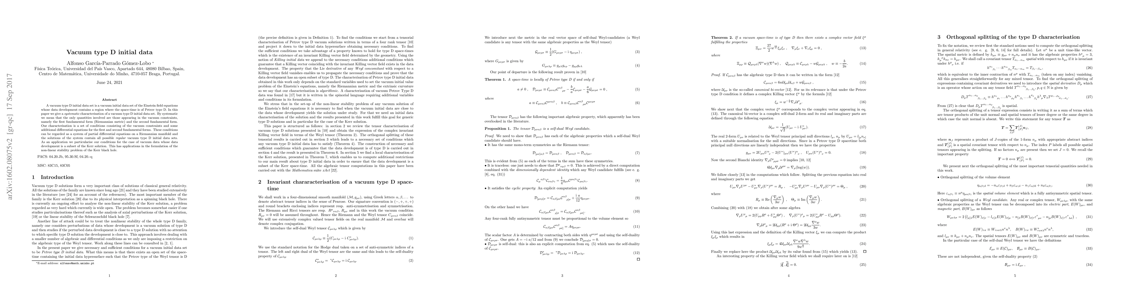 A vacuum type D initial data set is a vacuum initial data set of the Einstein field equations whose data development contains a region where the space-time is of Petrov type D. In this paper we give a {\em systematic} characterisation of a vacuum type D initial data set. By systematic we mean that the only quantities involved are those appearing in the vacuum constraints, namely the first fundamental form (Riemannian metric) and the second fundamental form. Our characterisation is a set of conditions consisting of the vacuum constraints and some additional differential equations for the first and second fundamental forms. These conditions can be regarded as a system of partial differential equations on a Riemannian manifold and the solutions of the system contain all possible {\em regular} vacuum type D initial data sets. As an application we particularise our conditions for the case of vacuum data whose data development is a subset of the Kerr solution. This has applications in the formulation of the non-linear stability problem of the Kerr black hole.