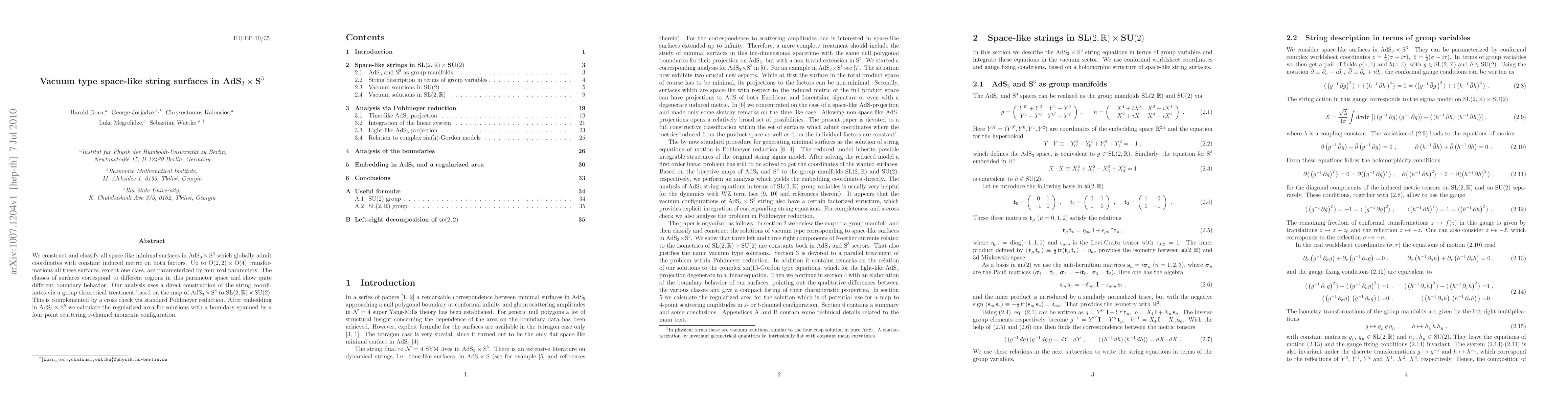 This paper constructs and classifies all space-like minimal surfaces in AdS_3 x S^3 using a group theoretical approach based on the map to SL(2,R) x SU(2). The surfaces are parameterized by four real parameters, and their distinct classes show varying boundary behaviors, with calculations of the regularized area for specific boundary configurations.