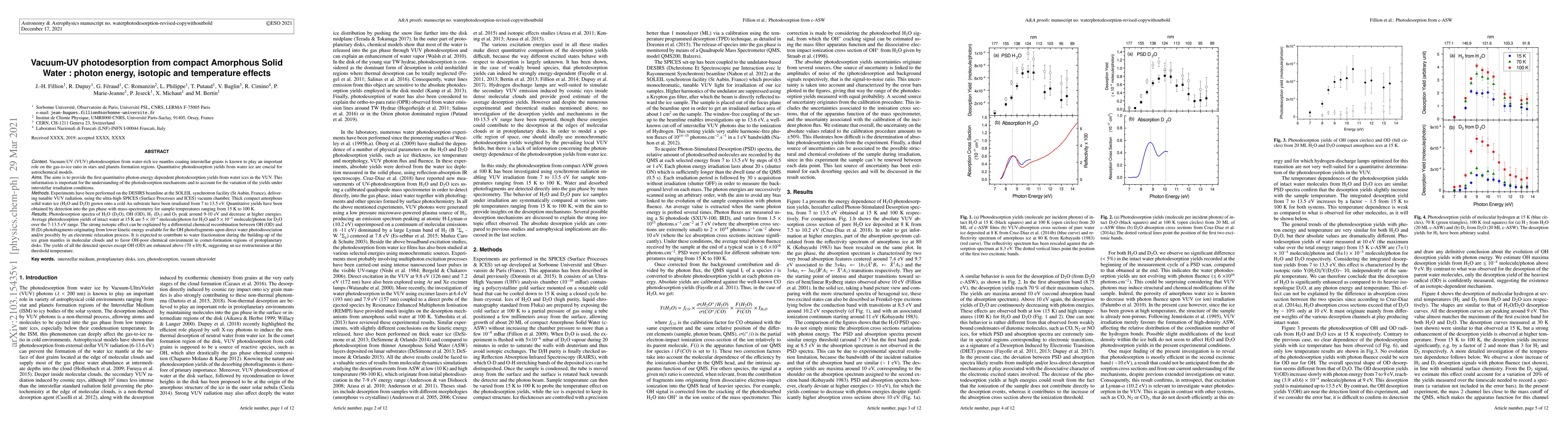 Vacuum-UV (VUV) photodesorption from water-rich ice mantles coating interstellar grains is known to play an important role in the gas-to-ice ratio in star- and planet-forming regions. Quantitative photodesorption yields from water ice are crucial for astrochemical models. We aim to provide the first quantitative photon-energy dependent photodesorption yields from water ice in the VUV. This information is important to understand the photodesorption mechanisms and to account for the variation of the yields under interstellar irradiation conditions. Experiments have been performed on the DESIRS beamline at the SOLEIL synchrotron, delivering tunable VUV light, using the SPICES (Surface Processes and ICES) set-up. Compact amorphous solid water ice (H$_2$O and D$_2$O) has been irradiated from 7 to 13.5 eV. Quantitative yields have been obtained by detection in the gas phase with mass-spectrometry for sample temperatures ranging from 15 K to 100 K. Photodesorption spectra of H$_2$O (D$_2$O), OH (OD), H$_2$ (D$_2$) and O$_2$ peak around 9-10 eV and decrease at higher energies. Average photodesorption yields of intact water at 15 K are 5 $\times$ 10$^{-4}$ molecule/photon for H$_2$O and 5 $\times$ 10$^{-5}$ molecule/photon for D$_2$O over the 7-13.5 eV range. The strong isotopic effect can be explained by a differential chemical recombination between OH (OD) and H (D) photofragments originating from lower kinetic energy available for the OH photofragments upon direct water photodissociation and/or possibly by an electronic relaxation process. It is expected to contribute to water fractionation during the building-up of the ice grain mantles in molecular clouds and to favor OH-poor chemical environment in comet-formation regions of protoplanetary disks. The yields of all the detected species except OH (OD) are enhanced above (70 $\pm$10) K, suggesting an ice restructuration at this temperature.