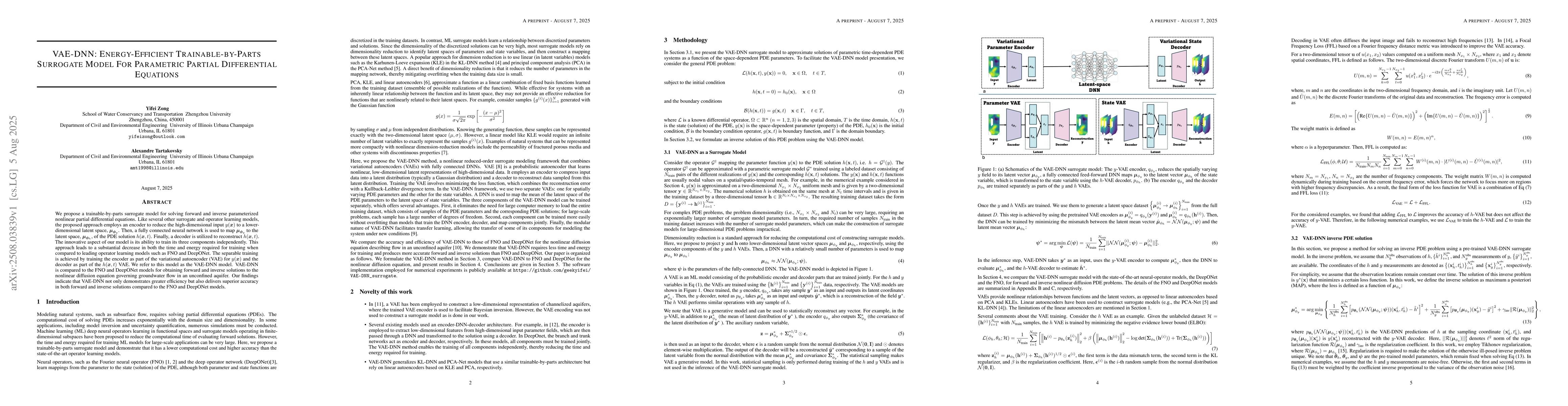 We propose a trainable-by-parts surrogate model for solving forward and inverse parameterized nonlinear partial differential equations. Like several other surrogate and operator learning models, the proposed approach employs an encoder to reduce the high-dimensional input $y(\bm{x})$ to a lower-dimensional latent space, $\bm\mu_{\bm\phi_y}$. Then, a fully connected neural network is used to map $\bm\mu_{\bm\phi_y}$ to the latent space, $\bm\mu_{\bm\phi_h}$, of the PDE solution $h(\bm{x},t)$. Finally, a decoder is utilized to reconstruct $h(\bm{x},t)$. The innovative aspect of our model is its ability to train its three components independently. This approach leads to a substantial decrease in both the time and energy required for training when compared to leading operator learning models such as FNO and DeepONet. The separable training is achieved by training the encoder as part of the variational autoencoder (VAE) for $y(\bm{x})$ and the decoder as part of the $h(\bm{x},t)$ VAE. We refer to this model as the VAE-DNN model. VAE-DNN is compared to the FNO and DeepONet models for obtaining forward and inverse solutions to the nonlinear diffusion equation governing groundwater flow in an unconfined aquifer. Our findings indicate that VAE-DNN not only demonstrates greater efficiency but also delivers superior accuracy in both forward and inverse solutions compared to the FNO and DeepONet models.
