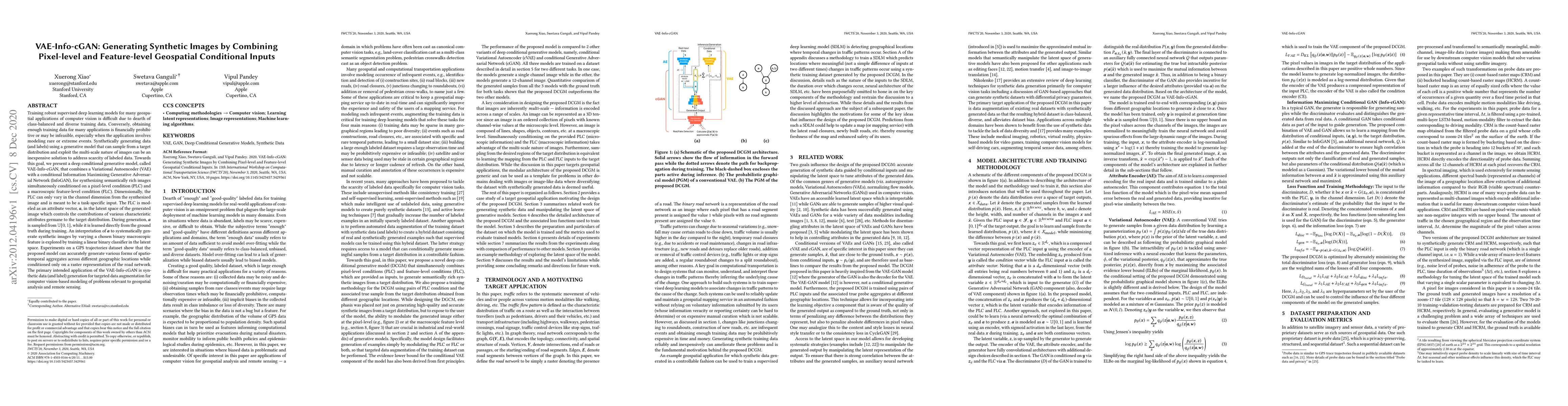Training robust supervised deep learning models for many geospatial applications of computer vision is difficult due to dearth of class-balanced and diverse training data. Conversely, obtaining enough training data for many applications is financially prohibitive or may be infeasible, especially when the application involves modeling rare or extreme events. Synthetically generating data (and labels) using a generative model that can sample from a target distribution and exploit the multi-scale nature of images can be an inexpensive solution to address scarcity of labeled data. Towards this goal, we present a deep conditional generative model, called VAE-Info-cGAN, that combines a Variational Autoencoder (VAE) with a conditional Information Maximizing Generative Adversarial Network (InfoGAN), for synthesizing semantically rich images simultaneously conditioned on a pixel-level condition (PLC) and a macroscopic feature-level condition (FLC). Dimensionally, the PLC can only vary in the channel dimension from the synthesized image and is meant to be a task-specific input. The FLC is modeled as an attribute vector in the latent space of the generated image which controls the contributions of various characteristic attributes germane to the target distribution. An interpretation of the attribute vector to systematically generate synthetic images by varying a chosen binary macroscopic feature is explored. Experiments on a GPS trajectories dataset show that the proposed model can accurately generate various forms of spatio-temporal aggregates across different geographic locations while conditioned only on a raster representation of the road network. The primary intended application of the VAE-Info-cGAN is synthetic data (and label) generation for targeted data augmentation for computer vision-based modeling of problems relevant to geospatial analysis and remote sensing.