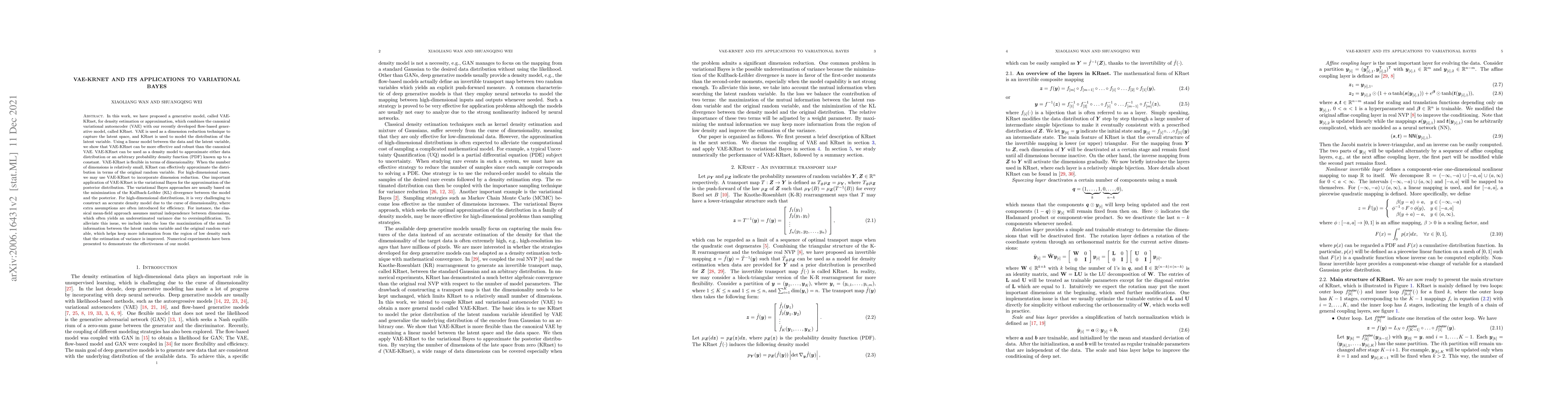 In this work, we have proposed a generative model, called VAE-KRnet, for density estimation or approximation, which combines the canonical variational autoencoder (VAE) with our recently developed flow-based generative model, called KRnet. VAE is used as a dimension reduction technique to capture the latent space, and KRnet is used to model the distribution of the latent variable. Using a linear model between the data and the latent variable, we show that VAE-KRnet can be more effective and robust than the canonical VAE. VAE-KRnet can be used as a density model to approximate either data distribution or an arbitrary probability density function (PDF) known up to a constant. VAE-KRnet is flexible in terms of dimensionality. When the number of dimensions is relatively small, KRnet can effectively approximate the distribution in terms of the original random variable. For high-dimensional cases, we may use VAE-KRnet to incorporate dimension reduction. One important application of VAE-KRnet is the variational Bayes for the approximation of the posterior distribution. The variational Bayes approaches are usually based on the minimization of the Kullback-Leibler (KL) divergence between the model and the posterior. For high-dimensional distributions, it is very challenging to construct an accurate density model due to the curse of dimensionality, where extra assumptions are often introduced for efficiency. For instance, the classical mean-field approach assumes mutual independence between dimensions, which often yields an underestimated variance due to oversimplification. To alleviate this issue, we include into the loss the maximization of the mutual information between the latent random variable and the original random variable, which helps keep more information from the region of low density such that the estimation of variance is improved.