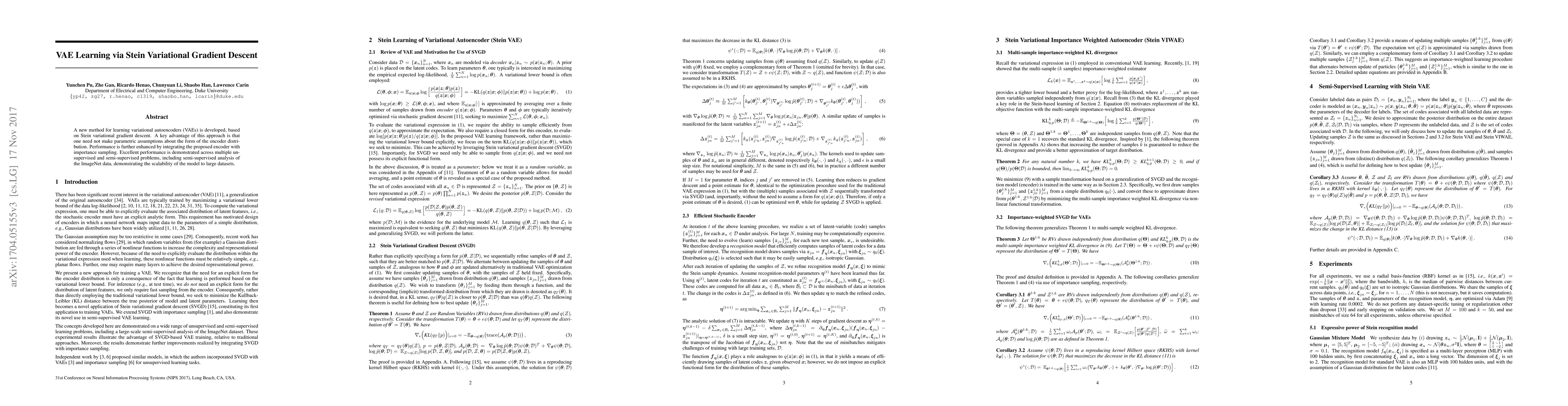 The paper presents Stein Variational Gradient Descent for learning VAEs without specifying a prior for the encoder distribution, combined with importance sampling for enhanced performance.