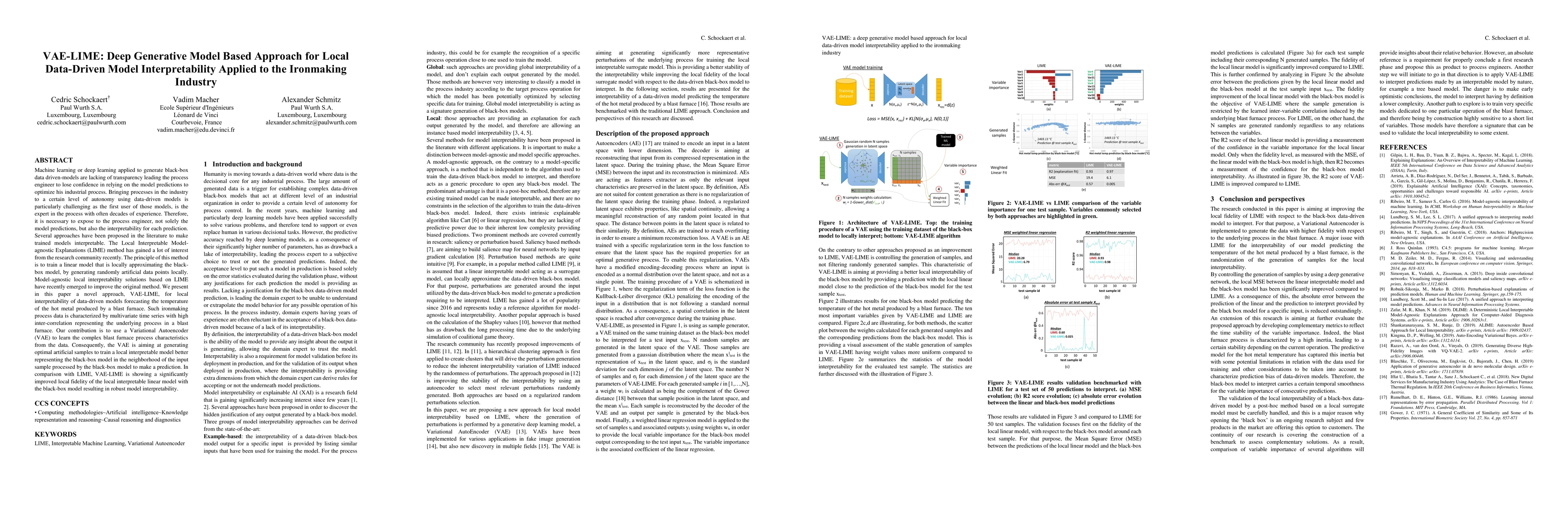 Machine learning applied to generate data-driven models are lacking of transparency leading the process engineer to lose confidence in relying on the model predictions to optimize his industrial process. Bringing processes in the industry to a certain level of autonomy using data-driven models is particularly challenging as the first user of those models, is the expert in the process with often decades of experience. It is necessary to expose to the process engineer, not solely the model predictions, but also their interpretability. To that end, several approaches have been proposed in the literature. The Local Interpretable Model-agnostic Explanations (LIME) method has gained a lot of interest from the research community recently. The principle of this method is to train a linear model that is locally approximating the black-box model, by generating randomly artificial data points locally. Model-agnostic local interpretability solutions based on LIME have recently emerged to improve the original method. We present in this paper a novel approach, VAE-LIME, for local interpretability of data-driven models forecasting the temperature of the hot metal produced by a blast furnace. Such ironmaking process data is characterized by multivariate time series with high inter-correlation representing the underlying process in a blast furnace. Our contribution is to use a Variational Autoencoder (VAE) to learn the complex blast furnace process characteristics from the data. The VAE is aiming at generating optimal artificial samples to train a local interpretable model better representing the black-box model in the neighborhood of the input sample processed by the black-box model to make a prediction. In comparison with LIME, VAE-LIME is showing a significantly improved local fidelity of the local interpretable linear model with the black-box model resulting in robust model interpretability.
