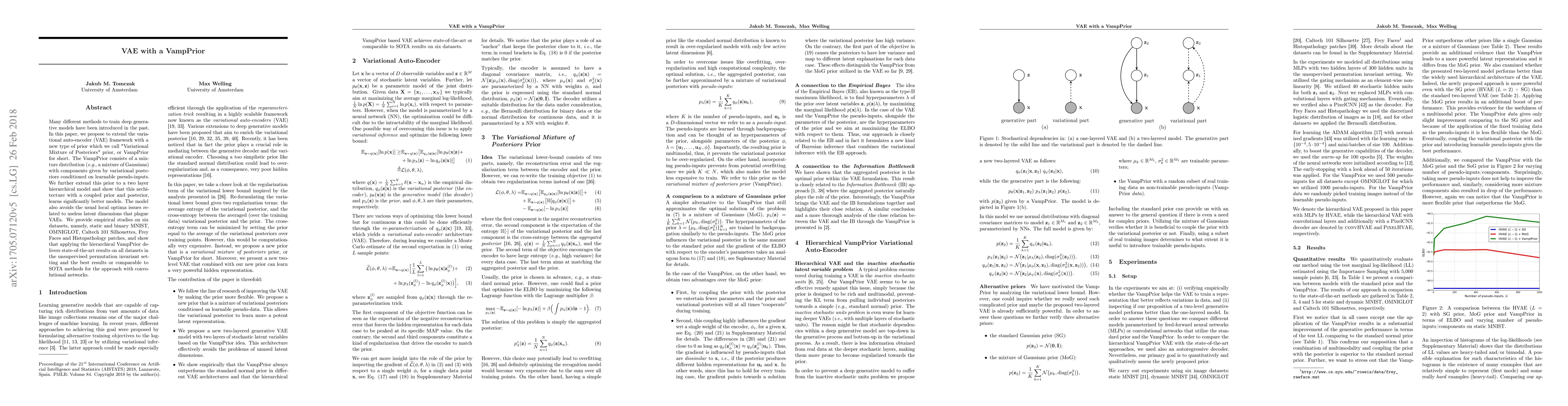 This paper proposes a Variational Auto-Encoder (VAE) extended with a VampPrior, a mixture of variational posteriors conditioned on pseudo-inputs, which improves model performance and avoids local optima issues. Empirical studies on six datasets show that the hierarchical VampPrior achieves state-of-the-art results in unsupervised settings and competitive results with convolutional networks.