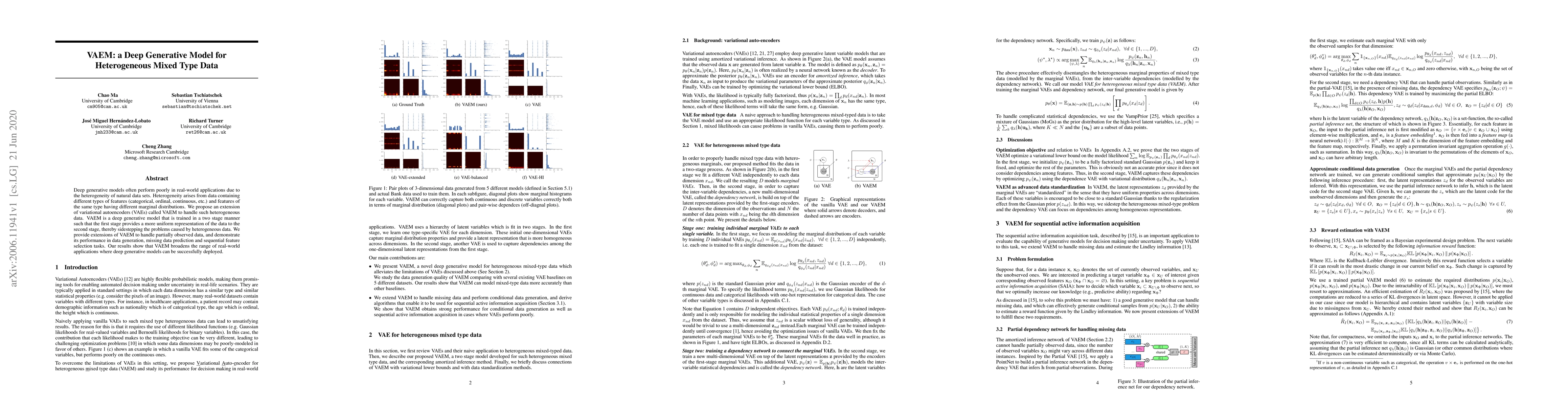 VAEM is a deep generative model that extends variational autoencoders to handle heterogeneous mixed-type data, improving performance through a two-stage training process. It demonstrates effectiveness in data generation, missing data prediction, and sequential feature selection.