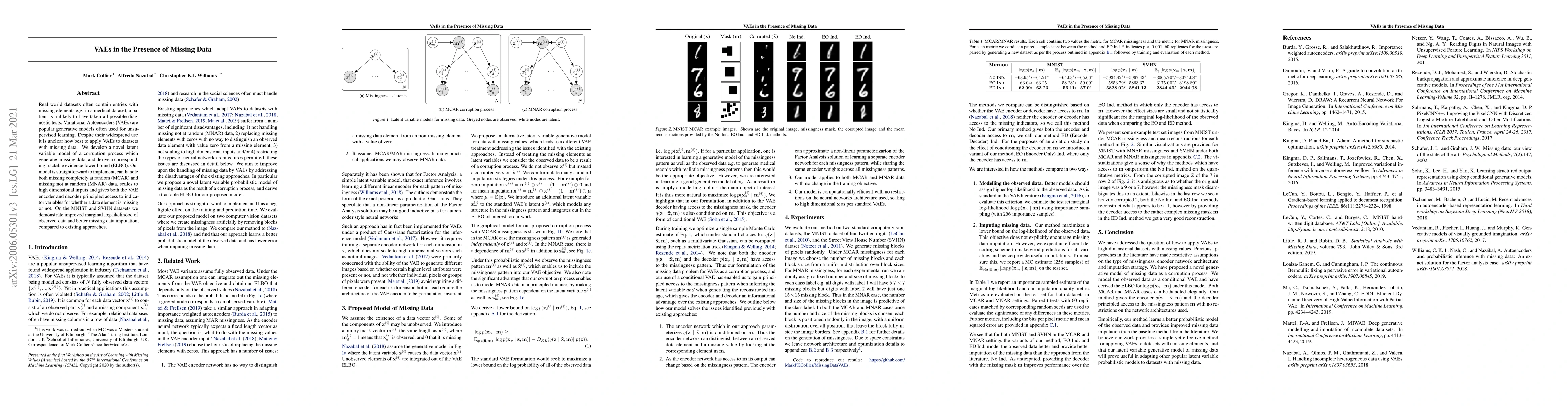 This paper proposes a novel latent variable model for Variational Autoencoders (VAEs) to handle missing data in datasets, providing a tractable evidence lower bound (ELBO) that can manage both MCAR and MNAR data types. The model improves marginal log-likelihood and missing data imputation on MNIST and SVHN datasets compared to existing methods.