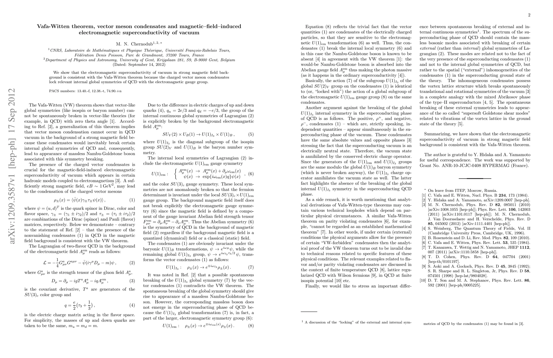 Summary: The paper demonstrates that strong magnetic fields can induce electromagnetic superconductivity in the vacuum, aligning with the Vafa-Witten theorem, due to the formation of charged vector meson condensates that lock relevant QCD symmetries with the electromagnetic gauge group.