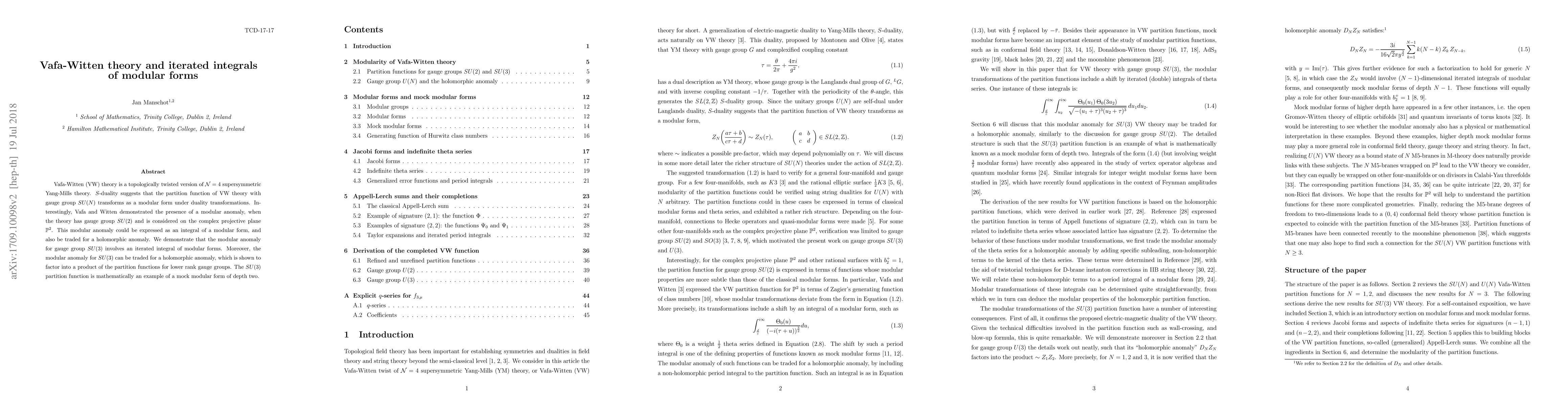 Vafa-Witten (VW) theory is a topologically twisted version of N=4 supersymmetric Yang-Mills theory. S-duality suggests that the partition function of VW theory with gauge group SU(N) transforms as a modular form under duality transformations. Interestingly, Vafa and Witten demonstrated the presence of a modular anomaly, when the theory has gauge group SU(2) and is considered on the complex projective plane P2. This modular anomaly could be expressed as an integral of a modular form, and also be traded for a holomorphic anomaly. We demonstrate that the modular anomaly for gauge group SU(3) involves an iterated integral of modular forms. Moreover, the modular anomaly for SU(3) can be traded for a holomorphic anomaly, which is shown to factor into a product of the partition functions for lower rank gauge groups. The SU(3) partition function is mathematically an example of a mock modular form of depth two.