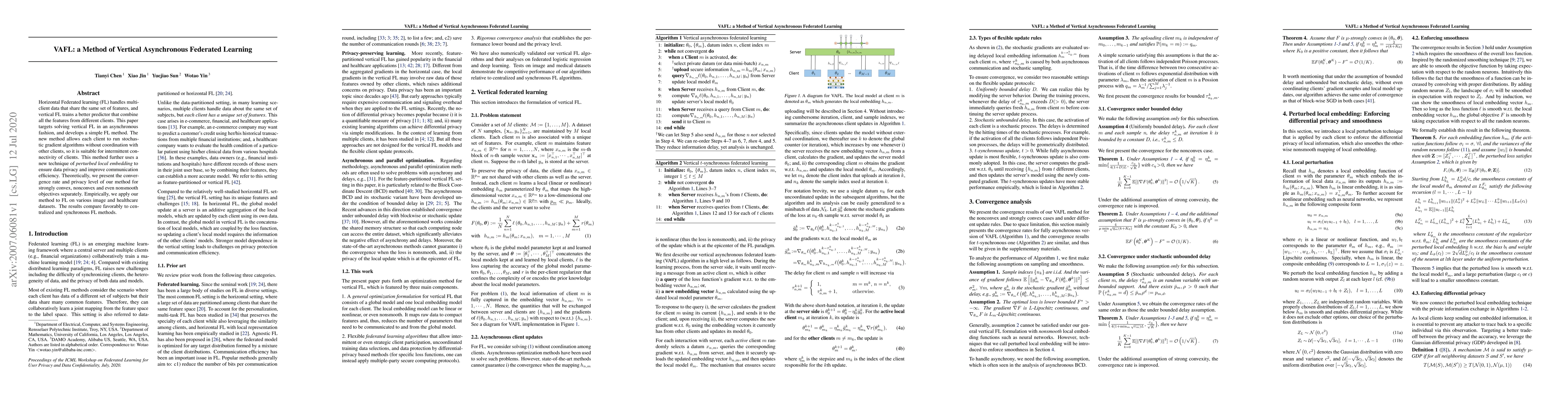 Horizontal Federated learning (FL) handles multi-client data that share the same set of features, and vertical FL trains a better predictor that combine all the features from different clients. This paper targets solving vertical FL in an asynchronous fashion, and develops a simple FL method. The new method allows each client to run stochastic gradient algorithms without coordination with other clients, so it is suitable for intermittent connectivity of clients. This method further uses a new technique of perturbed local embedding to ensure data privacy and improve communication efficiency. Theoretically, we present the convergence rate and privacy level of our method for strongly convex, nonconvex and even nonsmooth objectives separately. Empirically, we apply our method to FL on various image and healthcare datasets. The results compare favorably to centralized and synchronous FL methods.