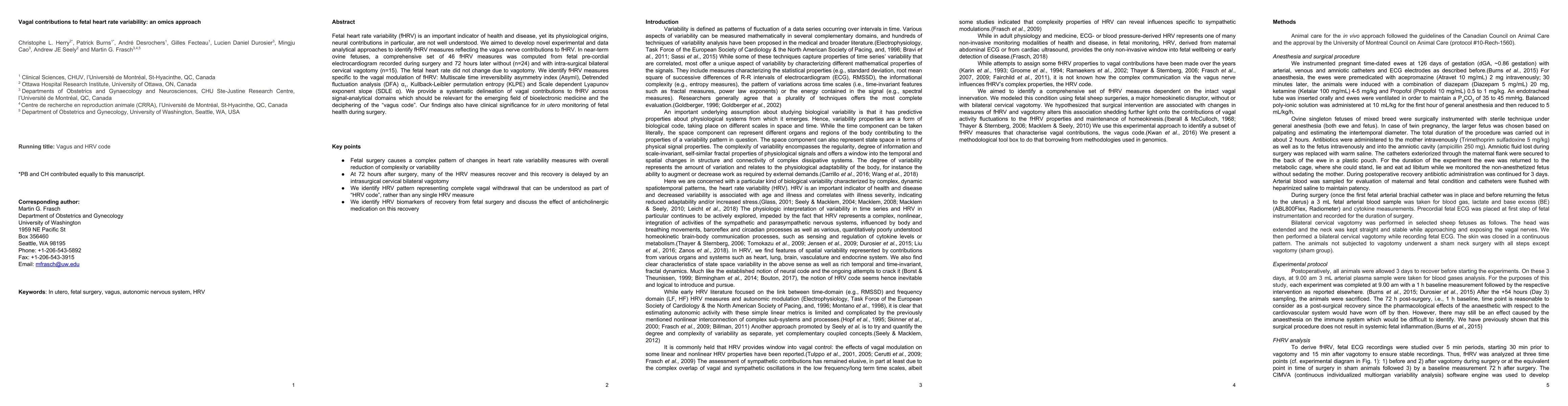 This study investigates fetal heart rate variability (fHRV) in near-term ovine fetuses, identifying specific fHRV measures reflecting vagal modulation after cervical vagotomy. The findings highlight the importance of the vagus nerve in fHRV and provide new insights for bioelectronic medicine and fetal health monitoring.