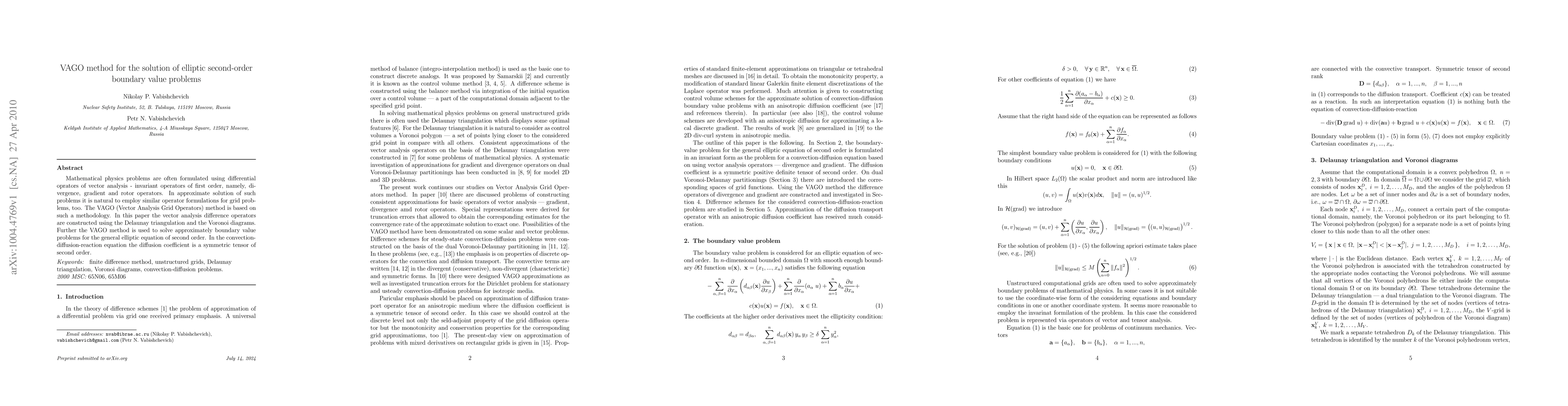 Mathematical physics problems are often formulated using differential oprators of vector analysis - invariant operators of first order, namely, divergence, gradient and rotor operators. In approximate solution of such problems it is natural to employ similar operator formulations for grid problems, too. The VAGO (Vector Analysis Grid Operators) method is based on such a methodology. In this paper the vector analysis difference operators are constructed using the Delaunay triangulation and the Voronoi diagrams. Further the VAGO method is used to solve approximately boundary value problems for the general elliptic equation of second order. In the convection-diffusion-reaction equation the diffusion coefficient is a symmetric tensor of second order.