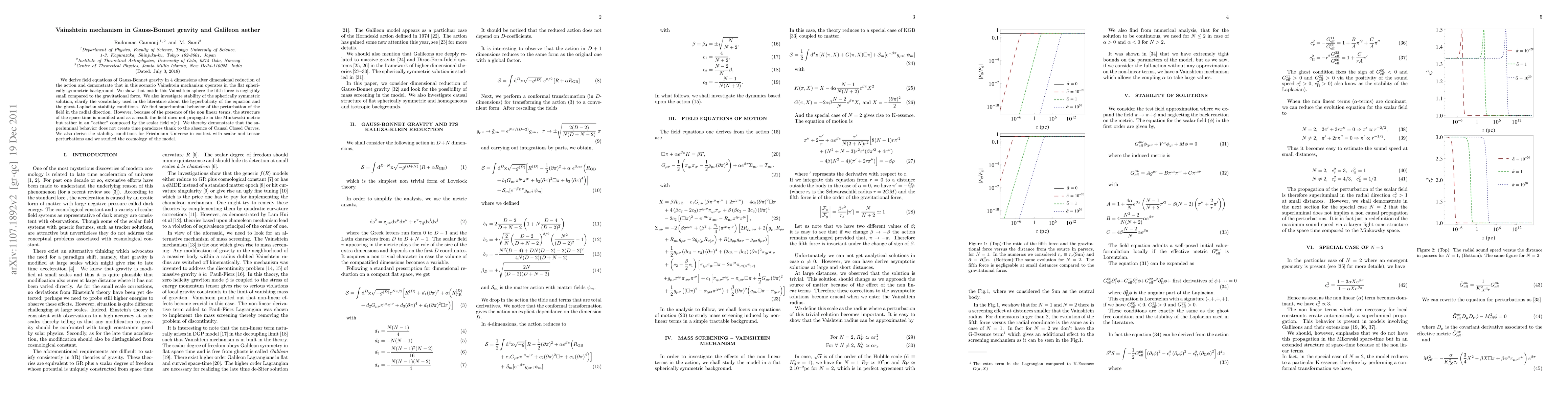 We derive field equations of Gauss-Bonnet gravity in 4 dimensions after dimensional reduction of the action and demonstrate that in this scenario Vainshtein mechanism operates in the flat spherically symmetric background. We show that inside this Vainshtein sphere the fifth force is negligibly small compared to the gravitational force. We also investigate stability of the spherically symmetric solution, clarify the vocabulary used in the literature about the hyperbolicity of the equation and the ghost-Laplacian stability conditions. We find superluminal behavior of the perturbation of the field in the radial direction. However, because of the presence of the non linear terms, the structure of the space-time is modified and as a result the field does not propagate in the Minkowski metric but rather in an "aether" composed by the scalar field $\pi(r)$. We thereby demonstrate that the superluminal behavior does not create time paradoxes thank to the absence of Causal Closed Curves. We also derive the stability conditions for Friedmann Universe in context with scalar and tensor perturbations.