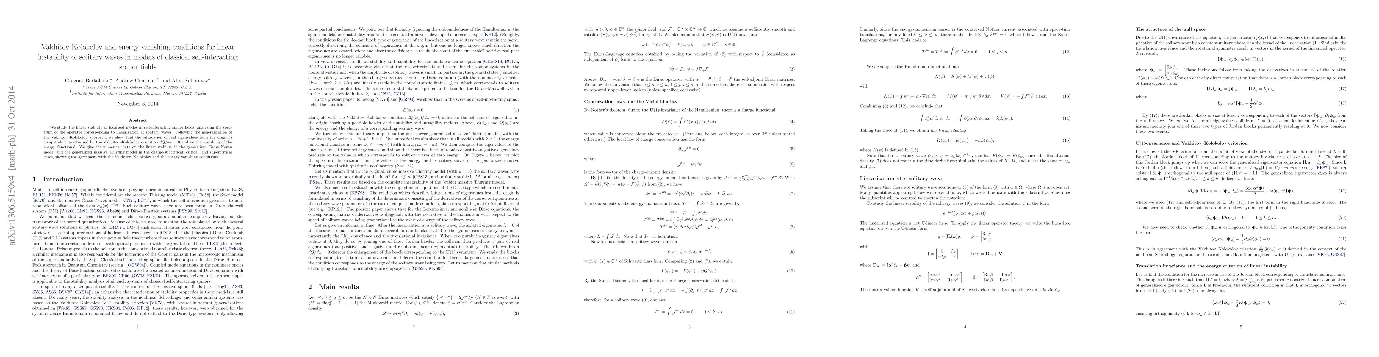 We study the linear stability of localized modes in self-interacting spinor fields, analyzing the spectrum of the operator corresponding to linearization at solitary waves. Following the generalization of the Vakhitov--Kolokolov approach, we show that the bifurcation of real eigenvalues from the origin is completely characterized by the Vakhitov--Kolokolov condition $dQ/d\omega=0$ and by the vanishing of the energy functional. We give the numerical data on the linear stability in the generalized Gross--Neveu model and the generalized massive Thirring model in the charge-subcritical, critical, and supercritical cases, showing the agreement with the Vakhitov--Kolokolov and the energy vanishing conditions.