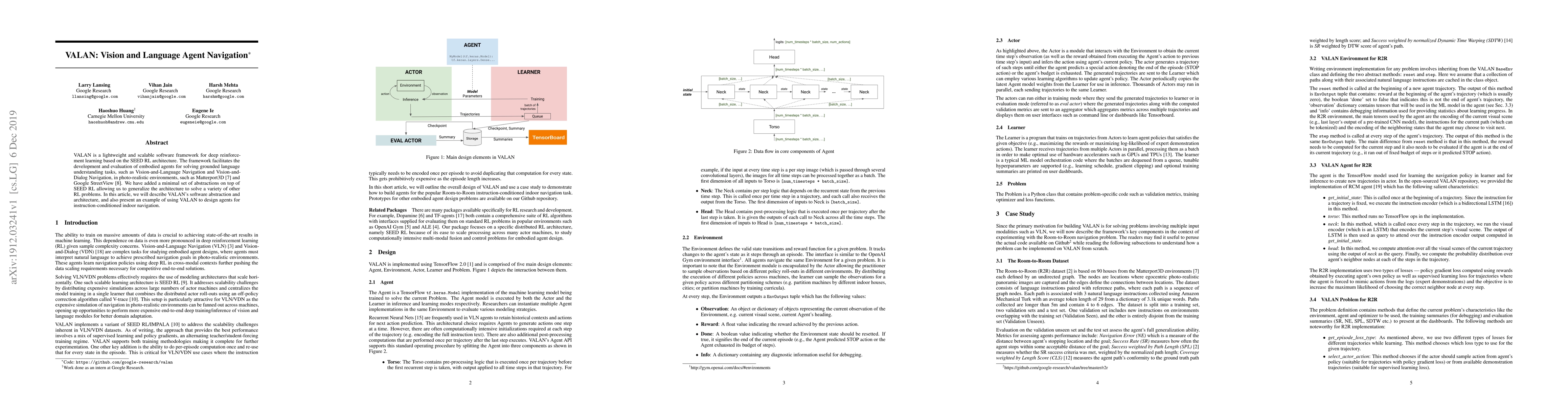 VALAN is a lightweight framework for deep reinforcement learning, based on SEED RL, designed for developing embodied agents to solve language-grounded tasks in photo-realistic environments. It demonstrates its capability through agents designed for instruction-conditioned indoor navigation.